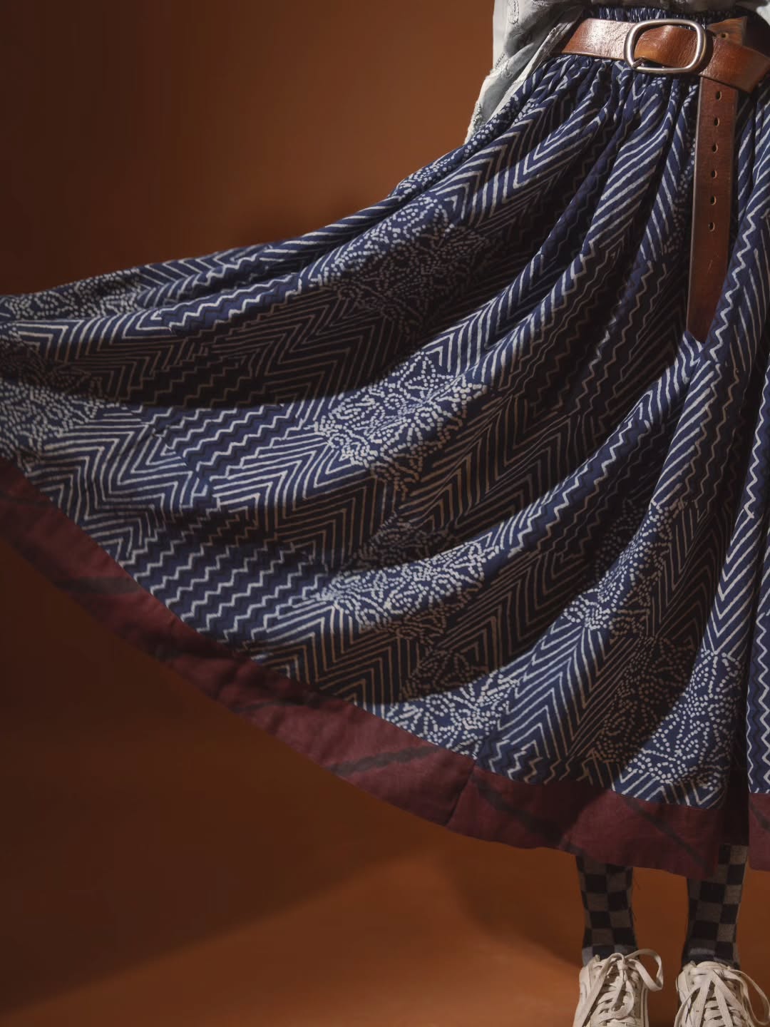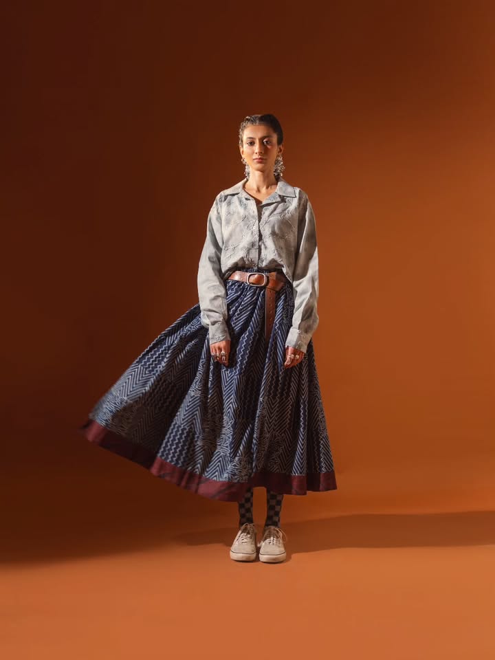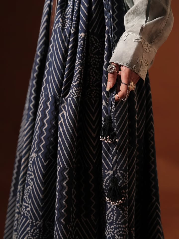 Indigo skirtMaterial: CottonTechnique: Hand Block Print/organic dying Care: separately handwash will bleed in 3 wash but never fade.