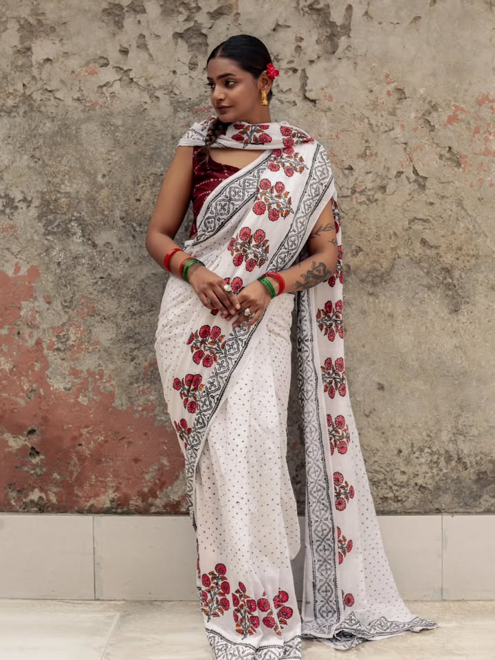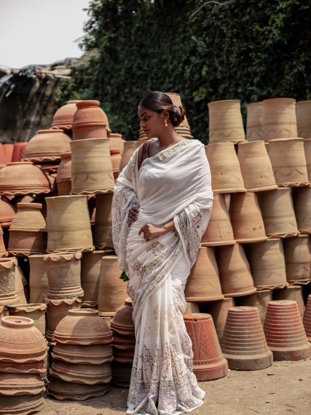 Dove Block-Printed Saree with transition from Blue to Yellow...