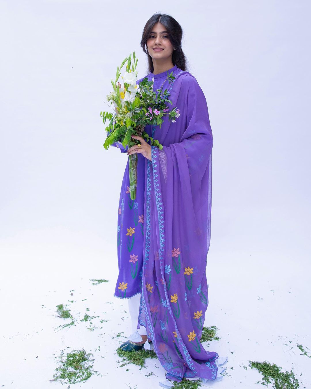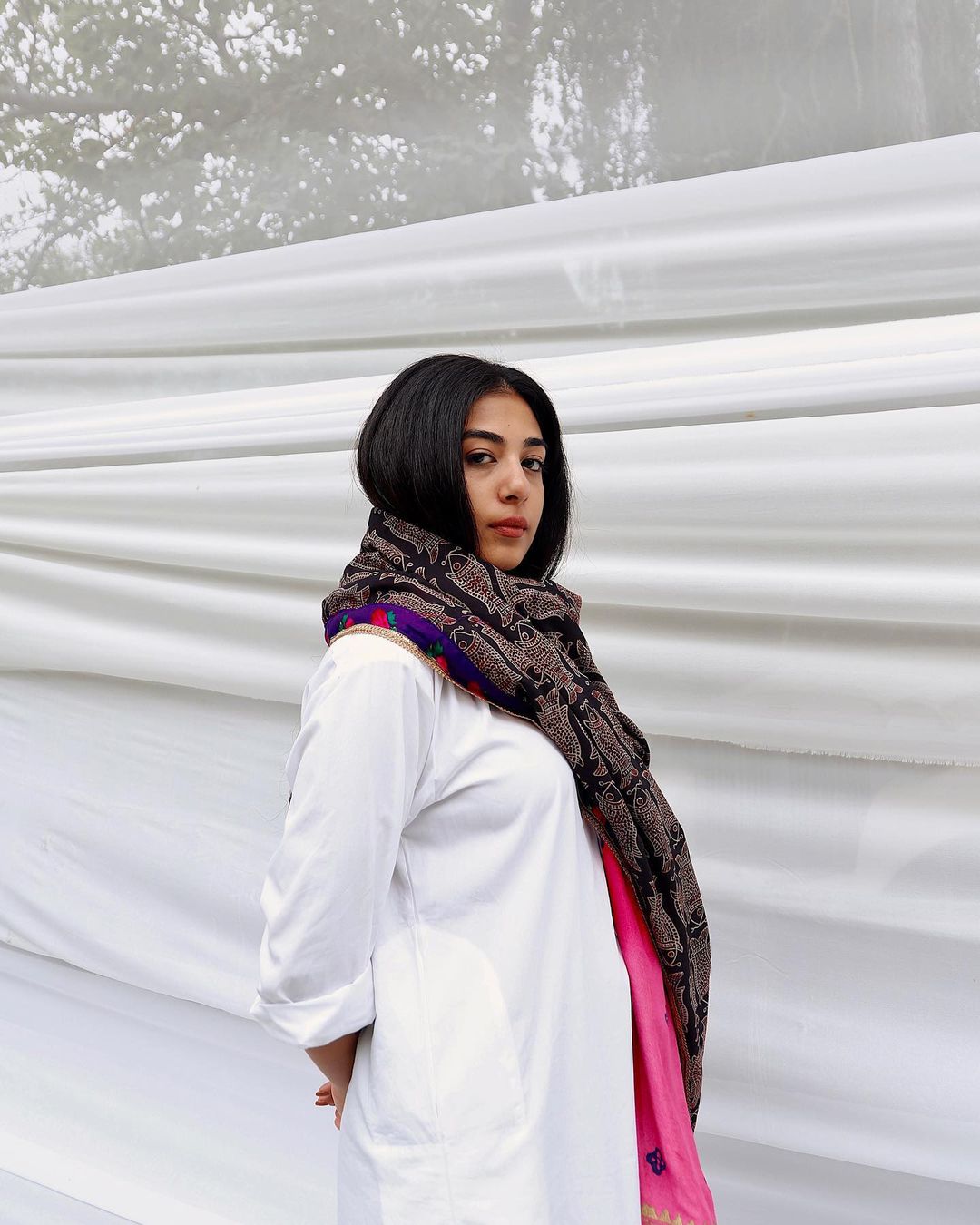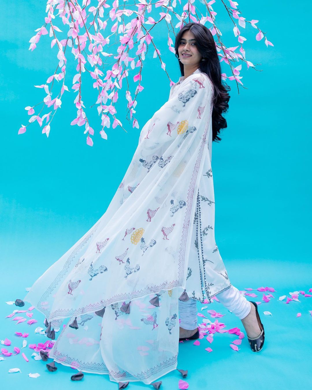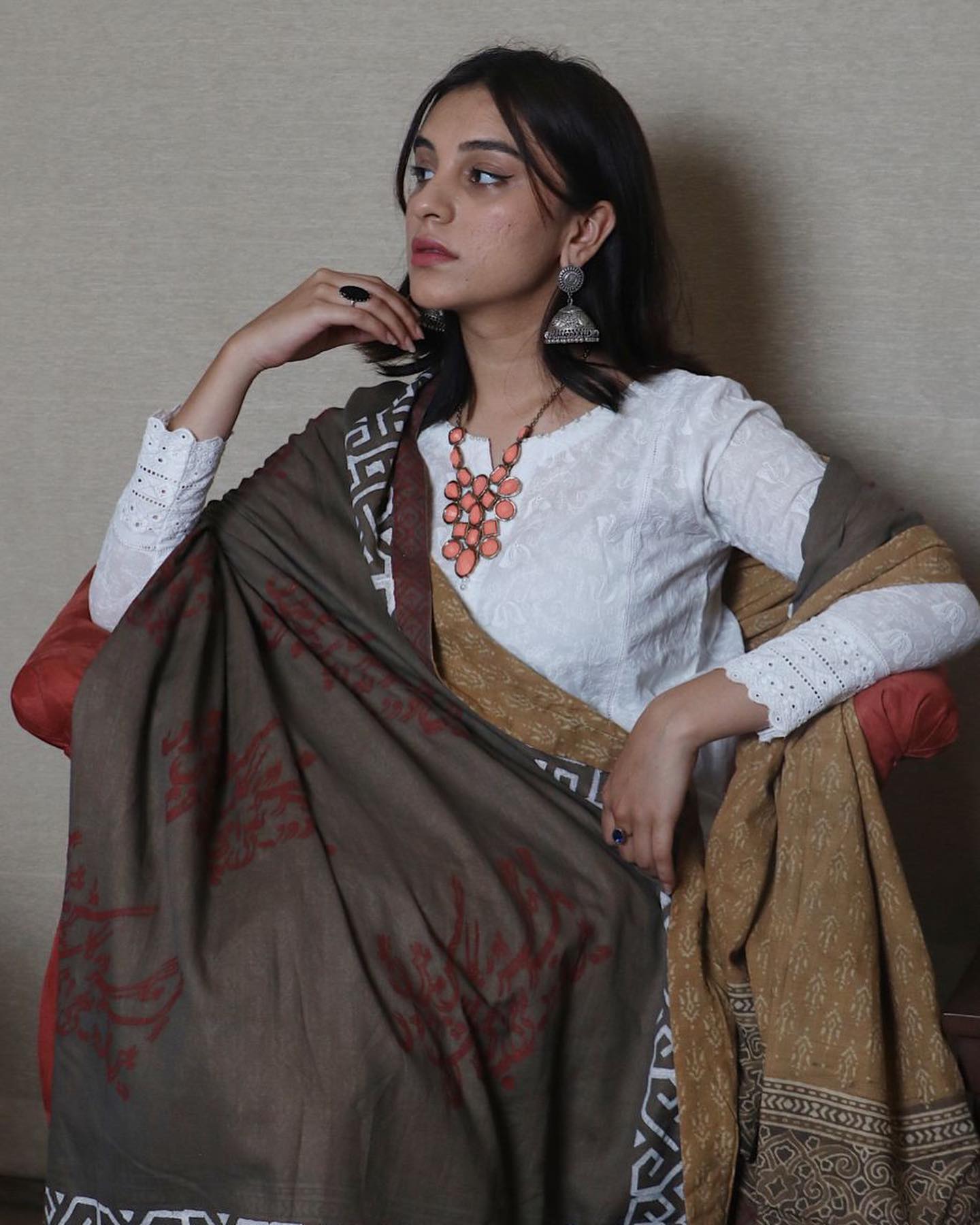 white kurta, with chiffon dupatta in block print