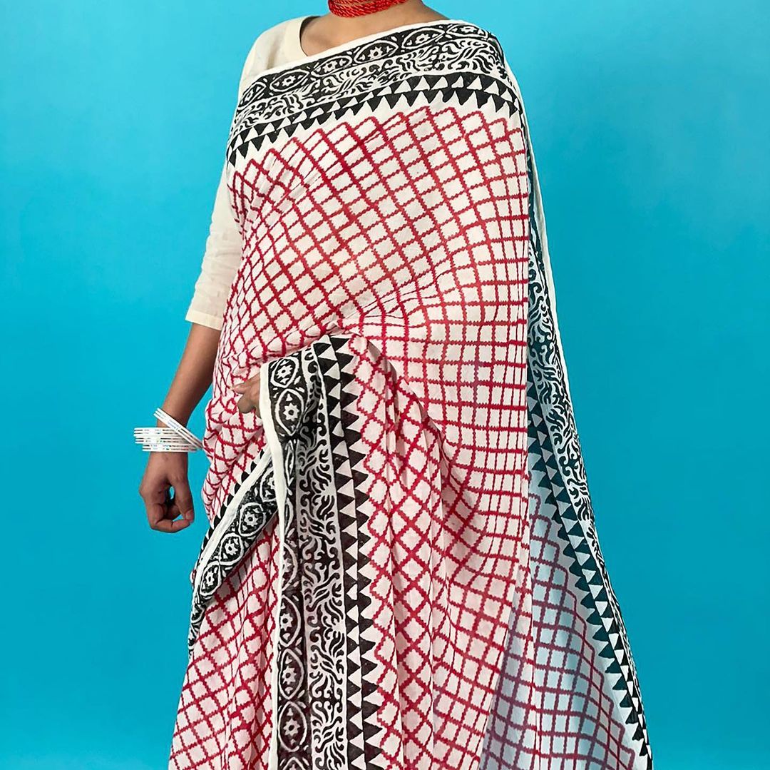 White cotton saree with black and red block print