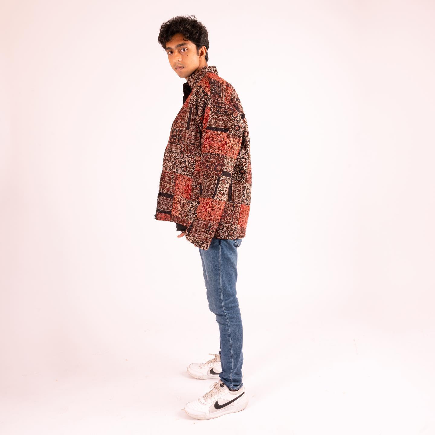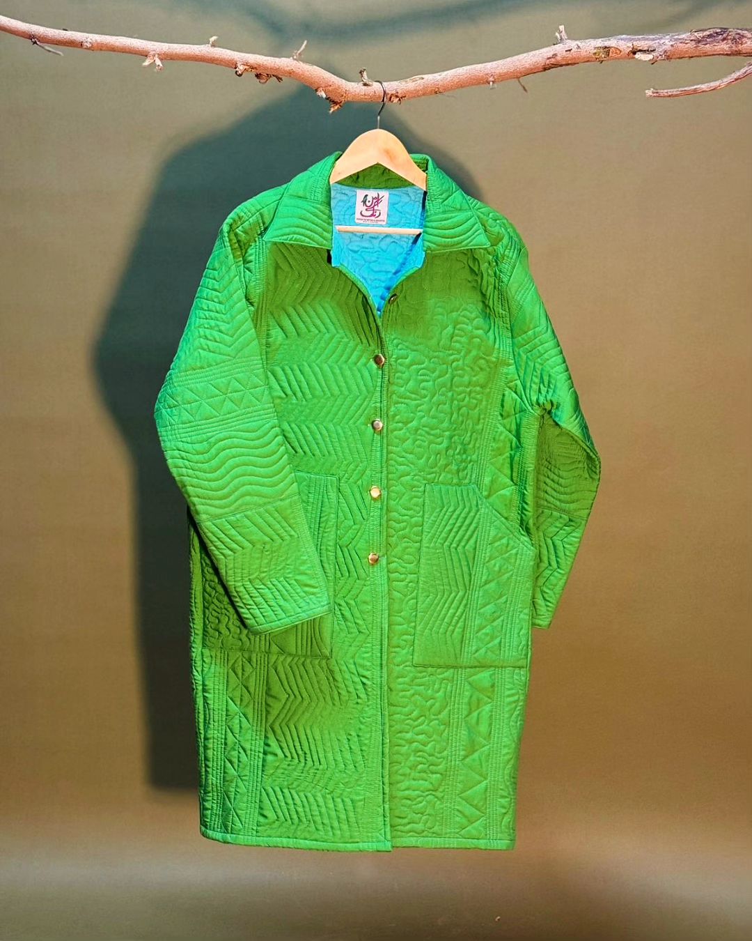 Patchwork quilted jacket with handcrafted kantha.