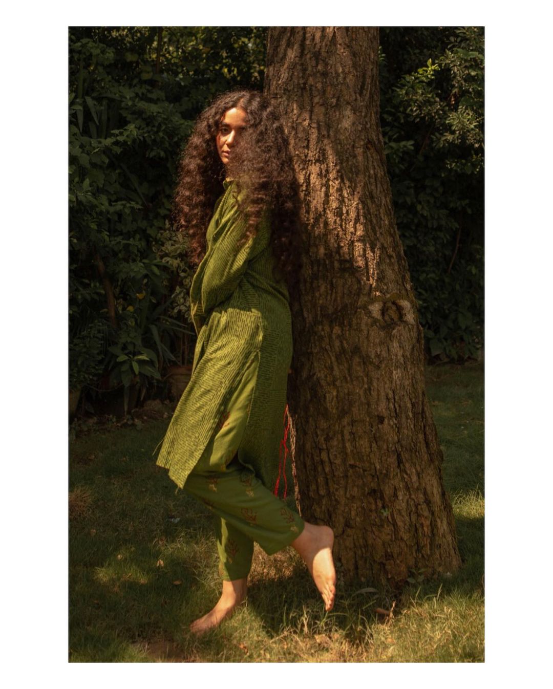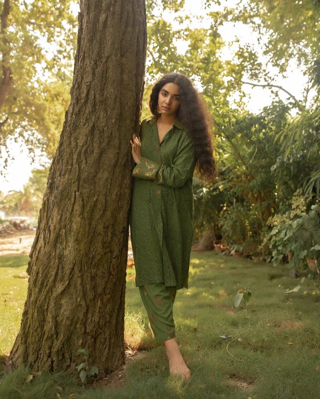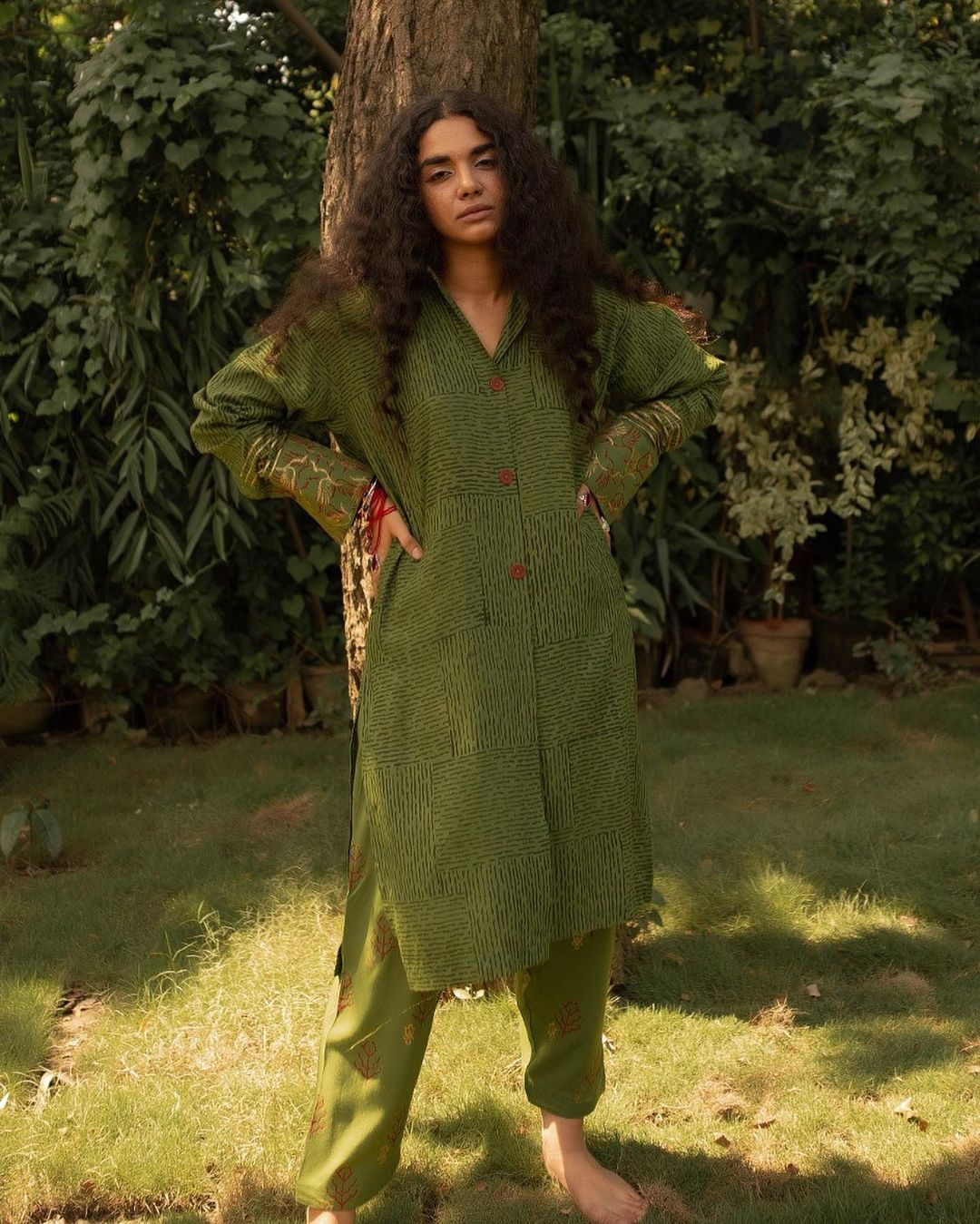 Block Printing all over the Kameez with Gold and Maroon Block-print on the Collar, cuff and Shalwar.