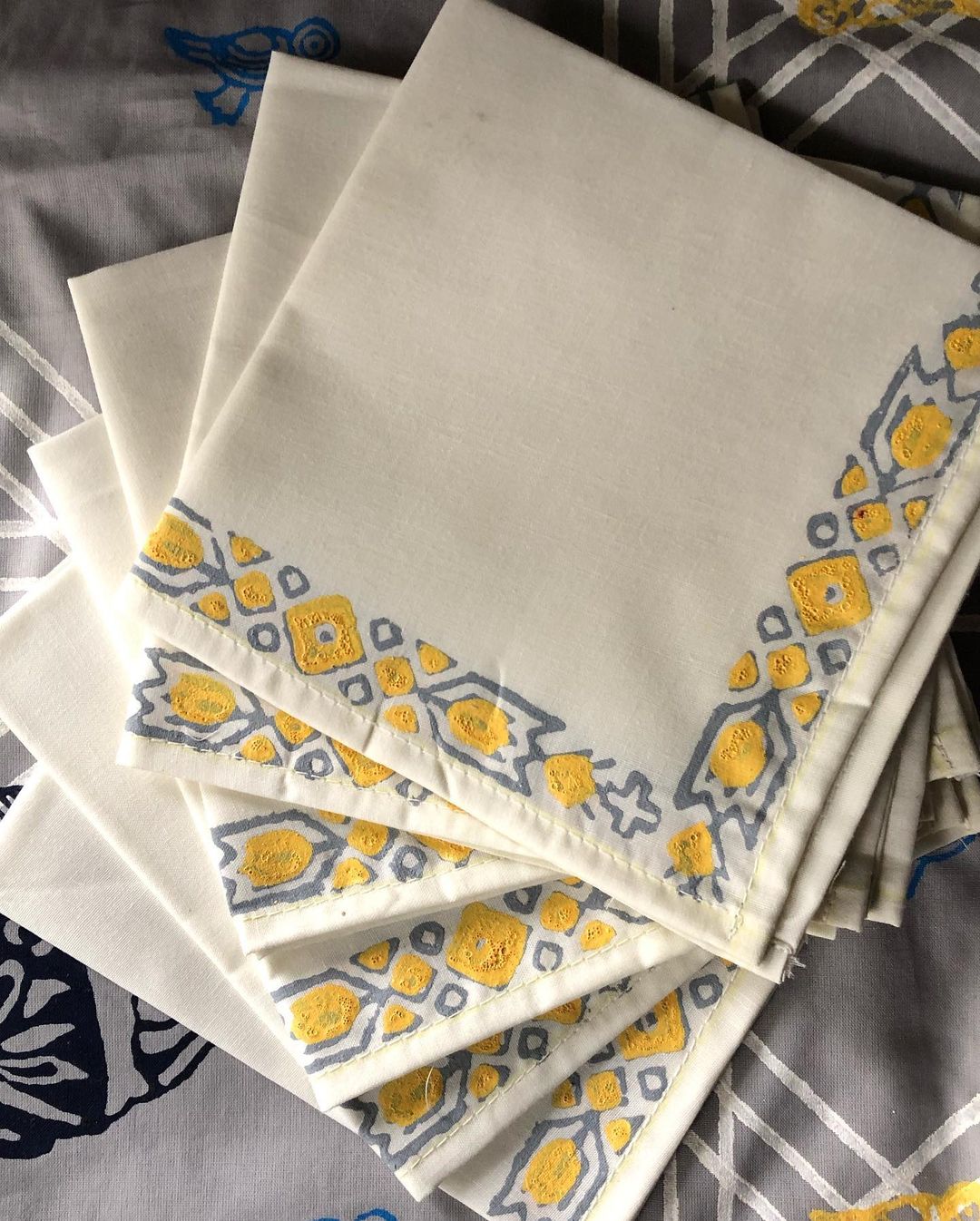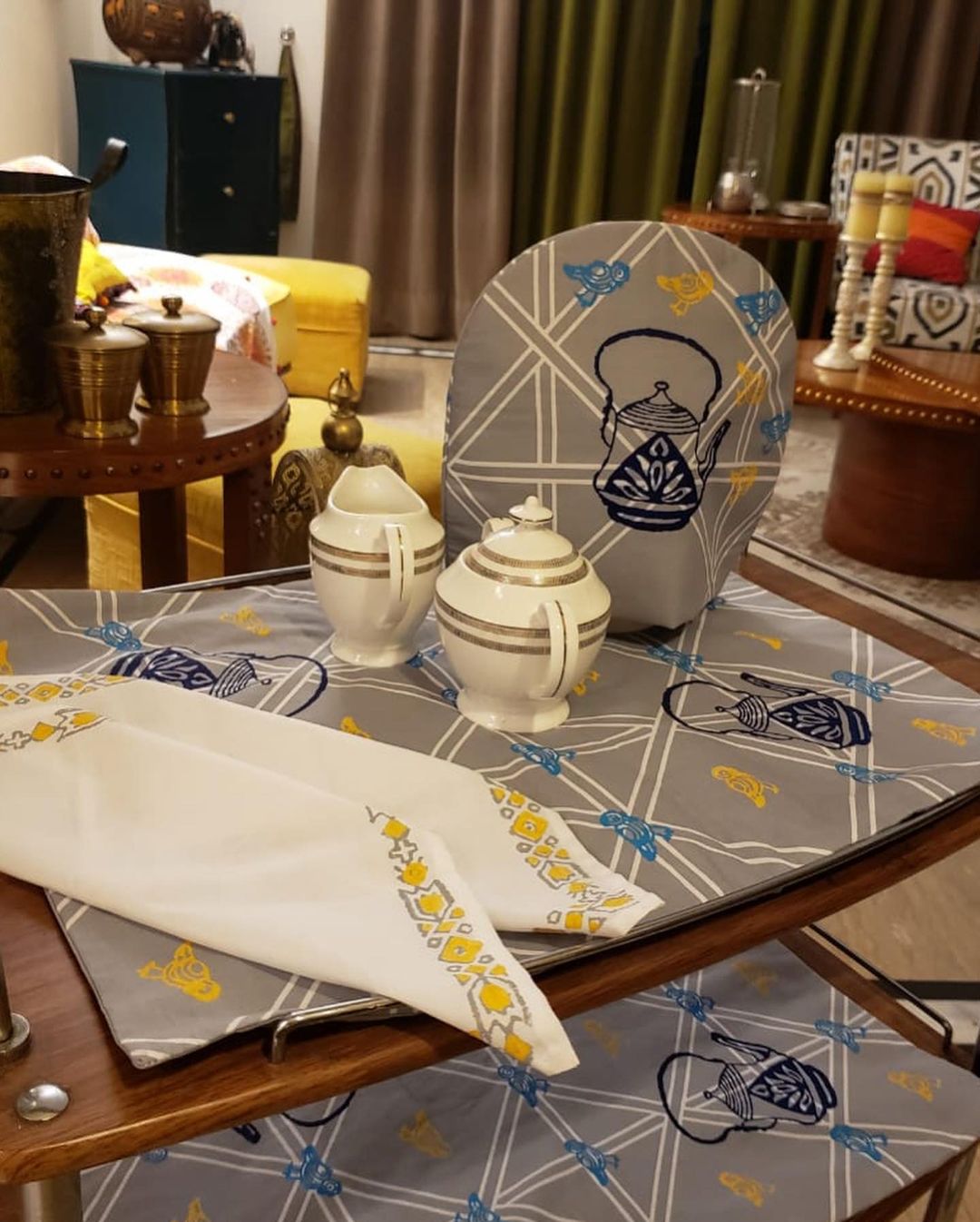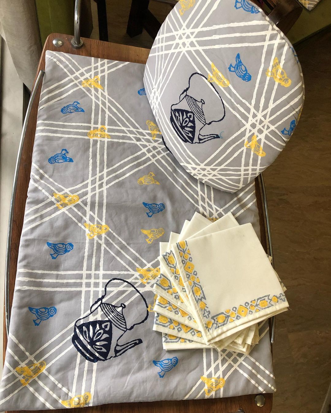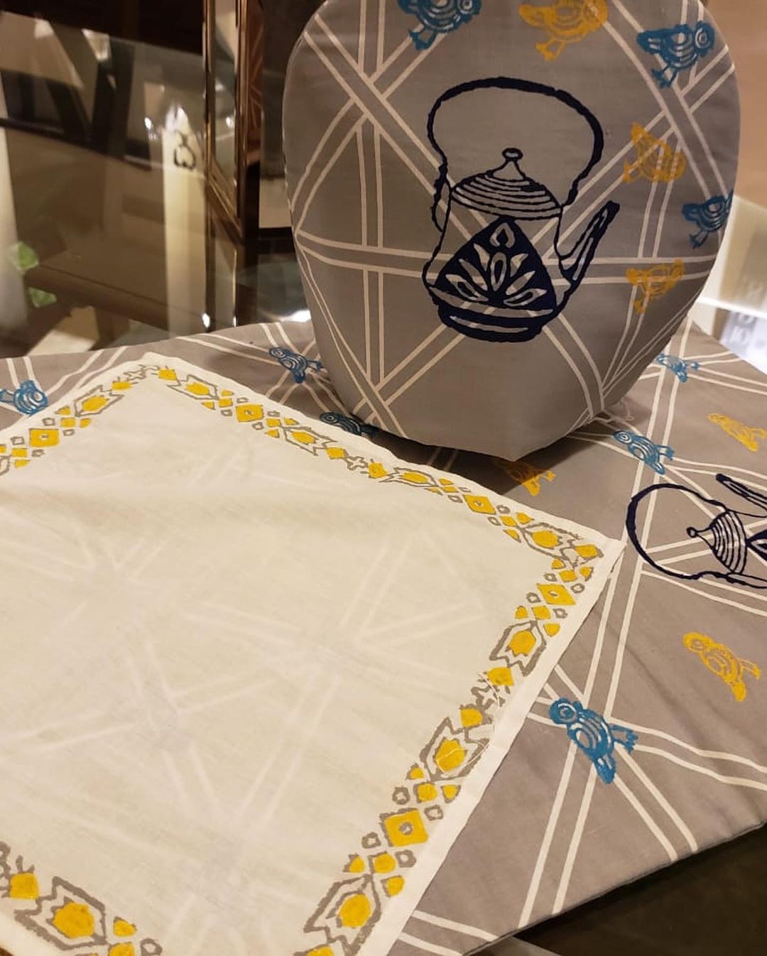 A set of quilted, block printed table mats paired with a matching teacosy and napkins. The perfect addition to spruce up your afternoon tea!
