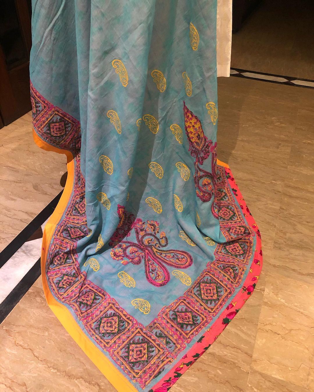 DOSHALA - Turquoise side with pink and yellow thappa all around in the most ethnic sense with orange piping on the borders. The other side of the beauty is in Fuchsia Pink floral pattern.