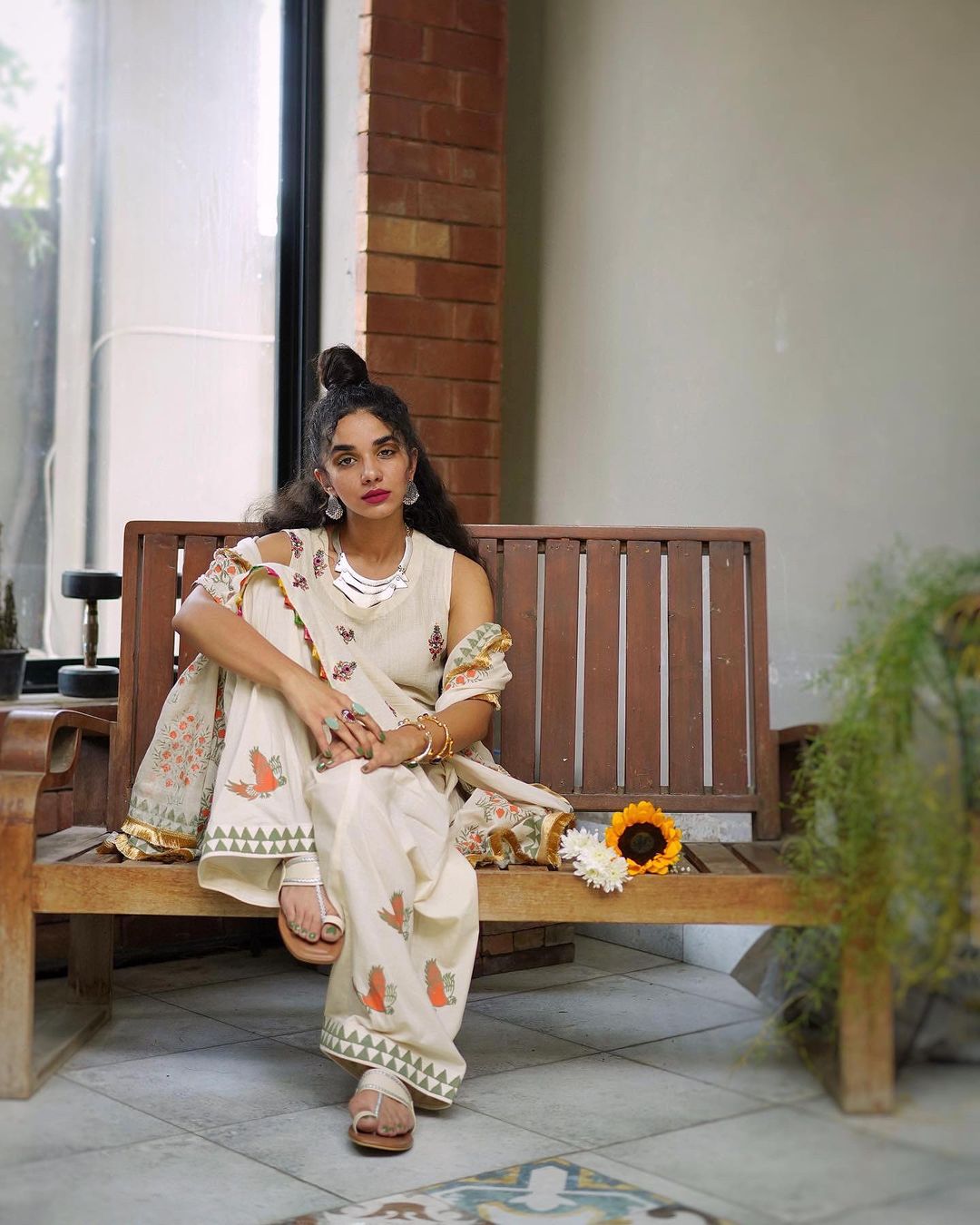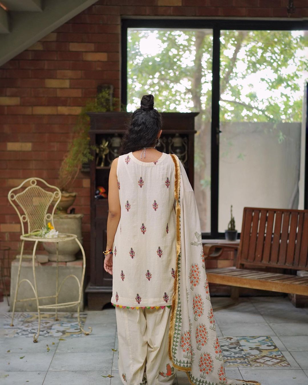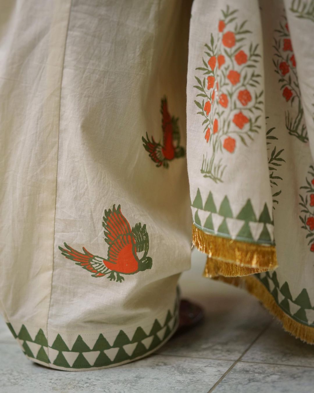 embroidered karandi shirt with block printed shalwar and dupatta