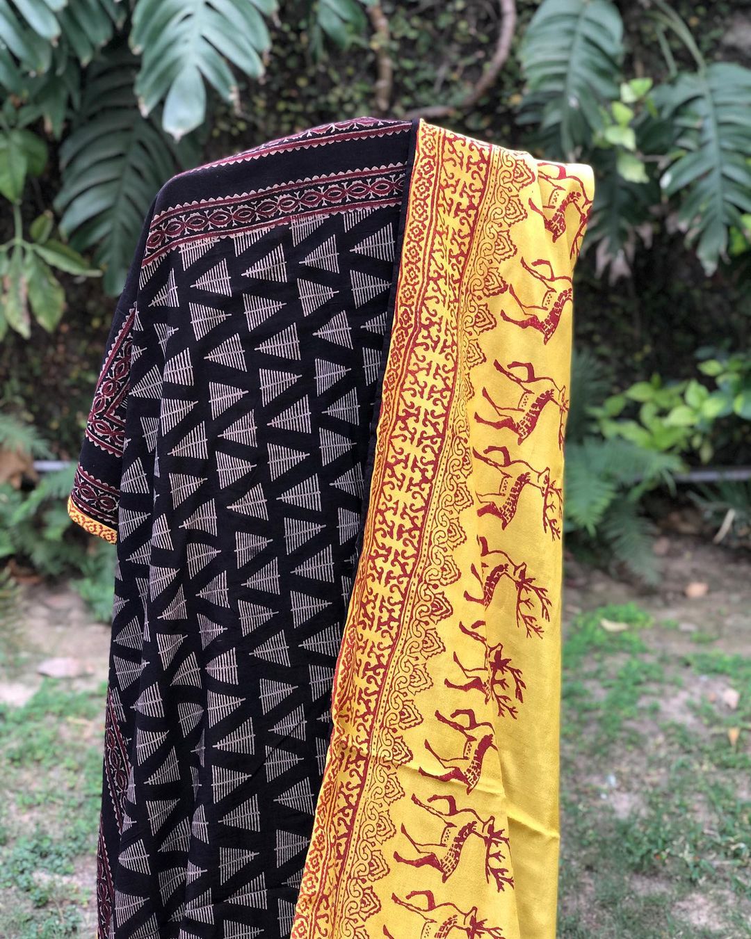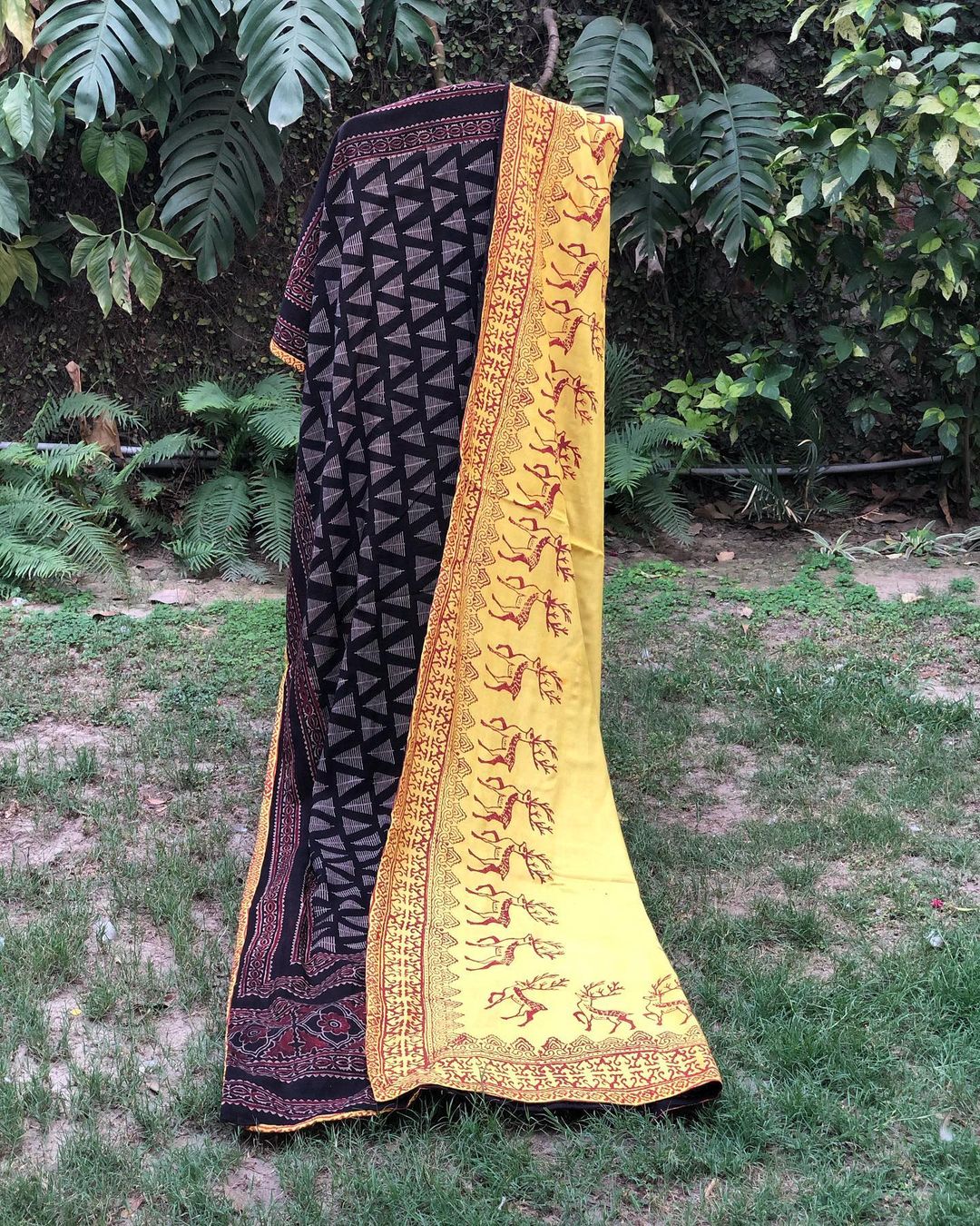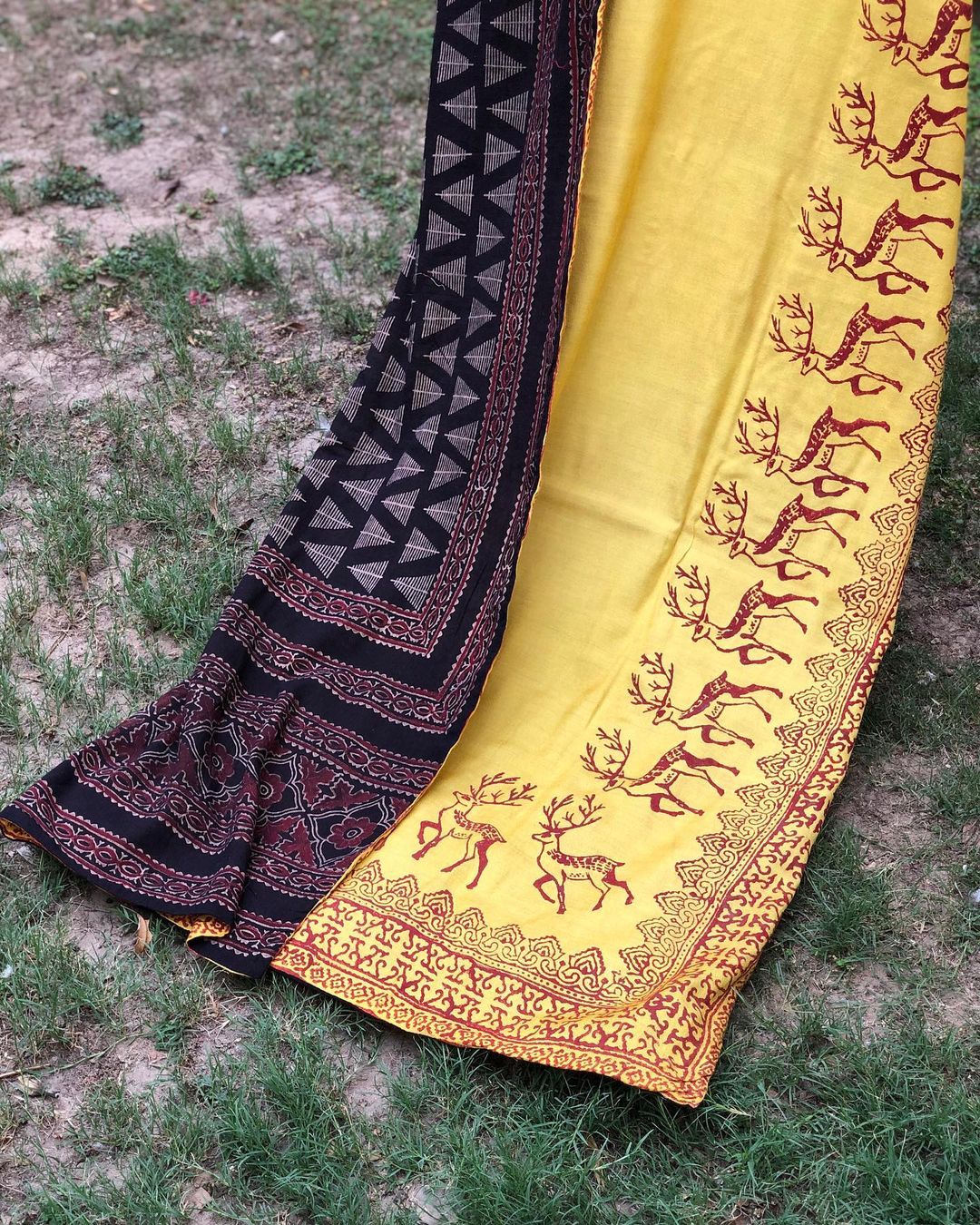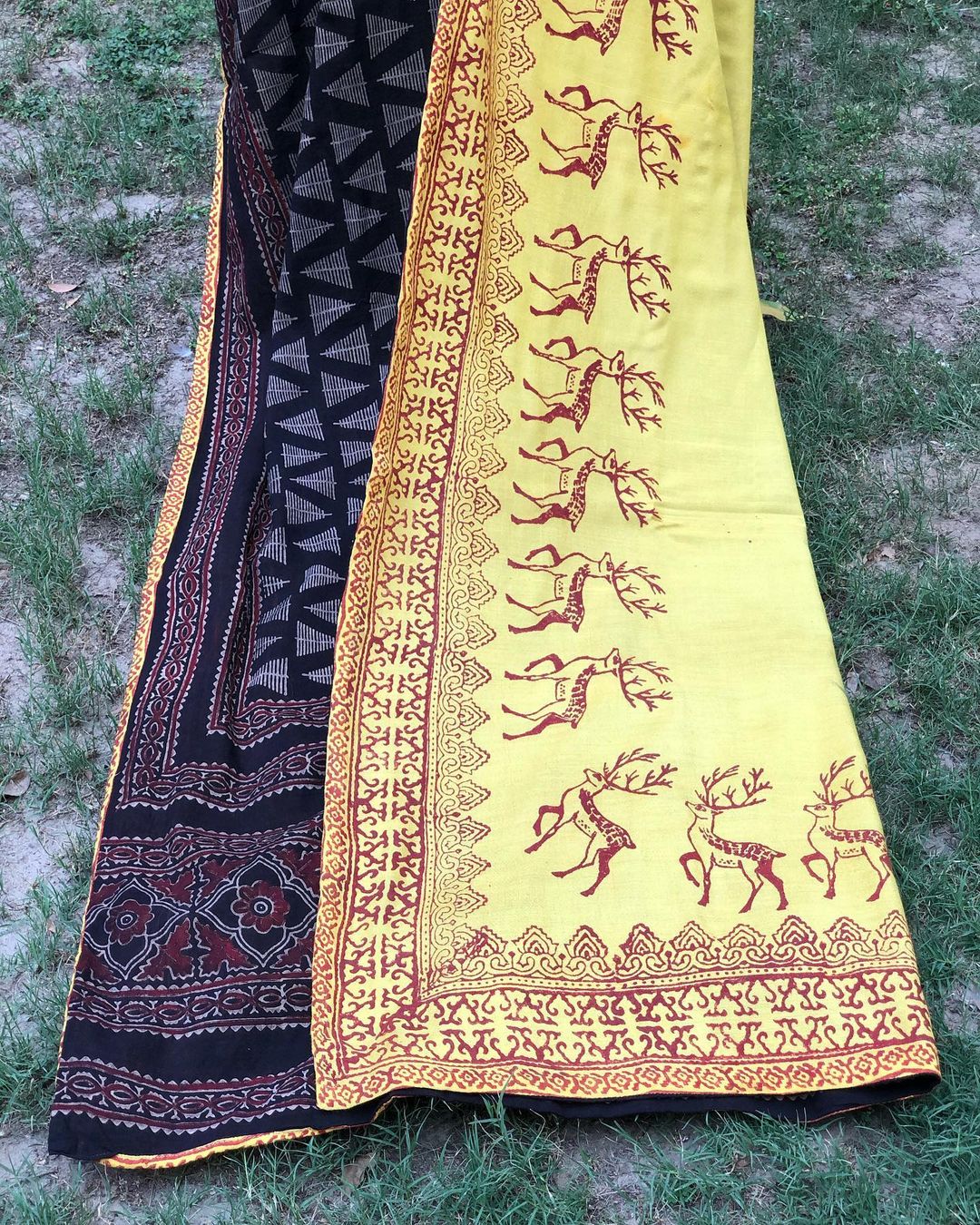 Tag: Hand block printed on both sides of Silk and Lawn.