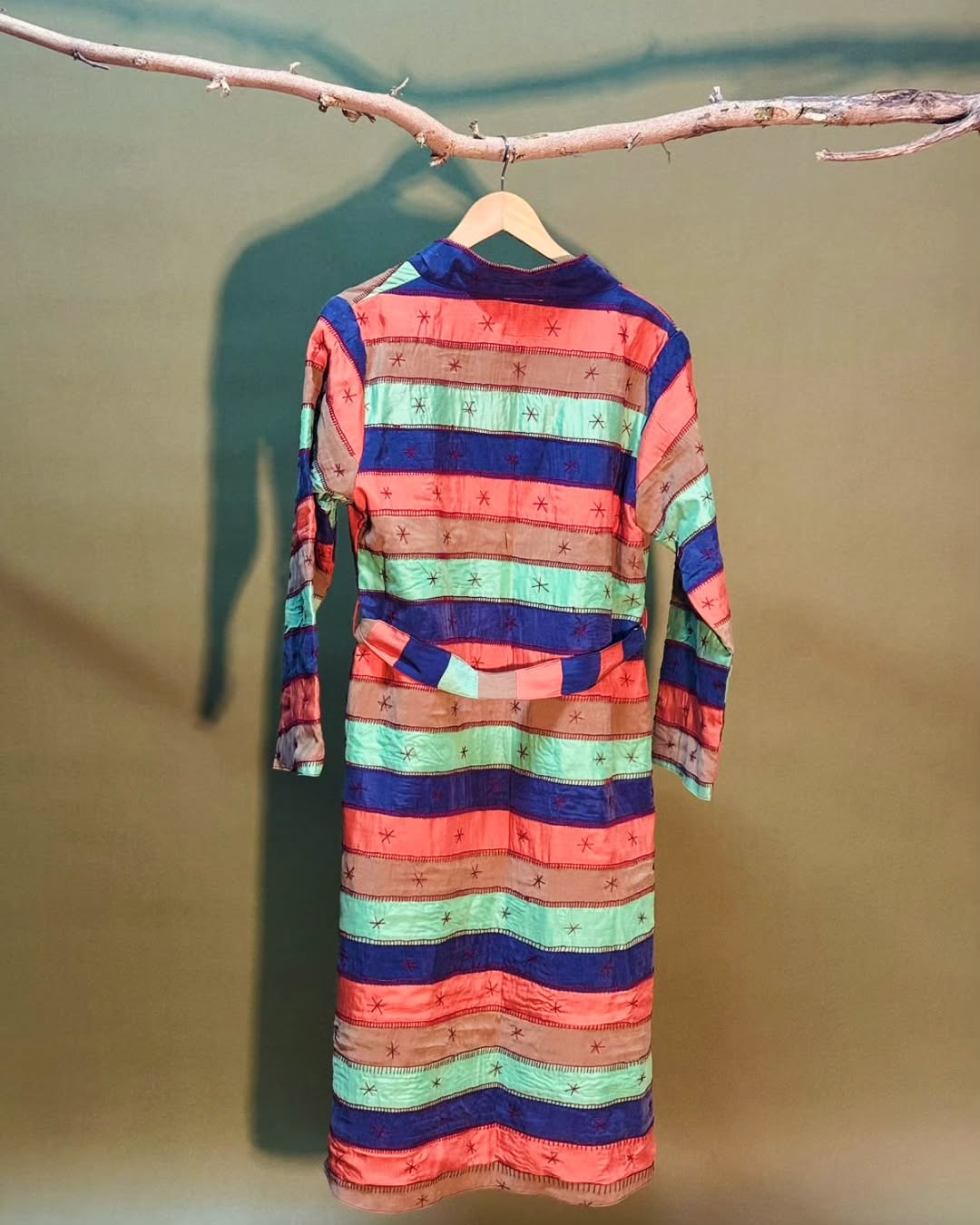 Introducing our one-of-a-kind patchwork kimono, a true masterpiece of artistry and sustainability. Crafted by attaching vibrant stripes with intricate kantha stitches, each piece tells a story of tradition and creativity. The delicate star design, also hand-stitched with kantha embroidery, adds a celestial charm, making this kimono a perfect blend of heritage and contemporary style. Wear it as a statement of uniqueness and celebrate the beauty of handmade fashion.