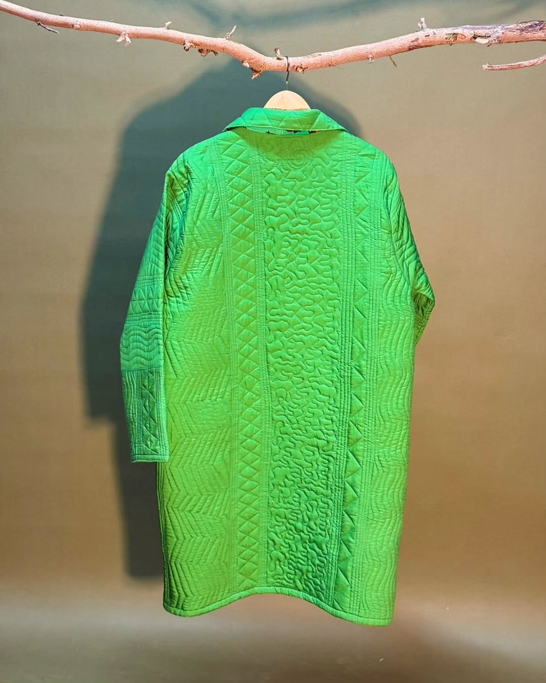 Elevate your winter wardrobe with our handcrafted Quilted Jacket, a masterpiece of comfort and elegance. The outer layer, crafted from luxurious cotton silk, exudes sophistication, while the inner marina-printed fabric adds a vibrant touch. Lightweight yet warm, this jacket is designed to keep you cozy without compromising on style. Every detail showcases meticulous craftsmanship, making it a timeless piece that seamlessly blends functionality with artistic expression.