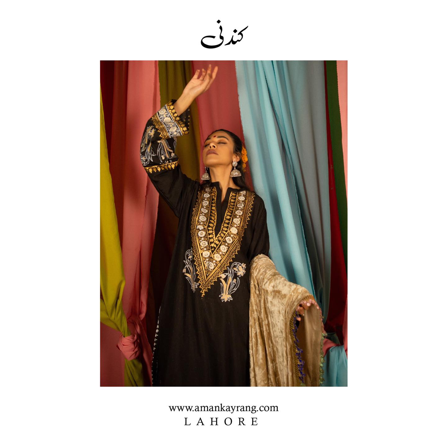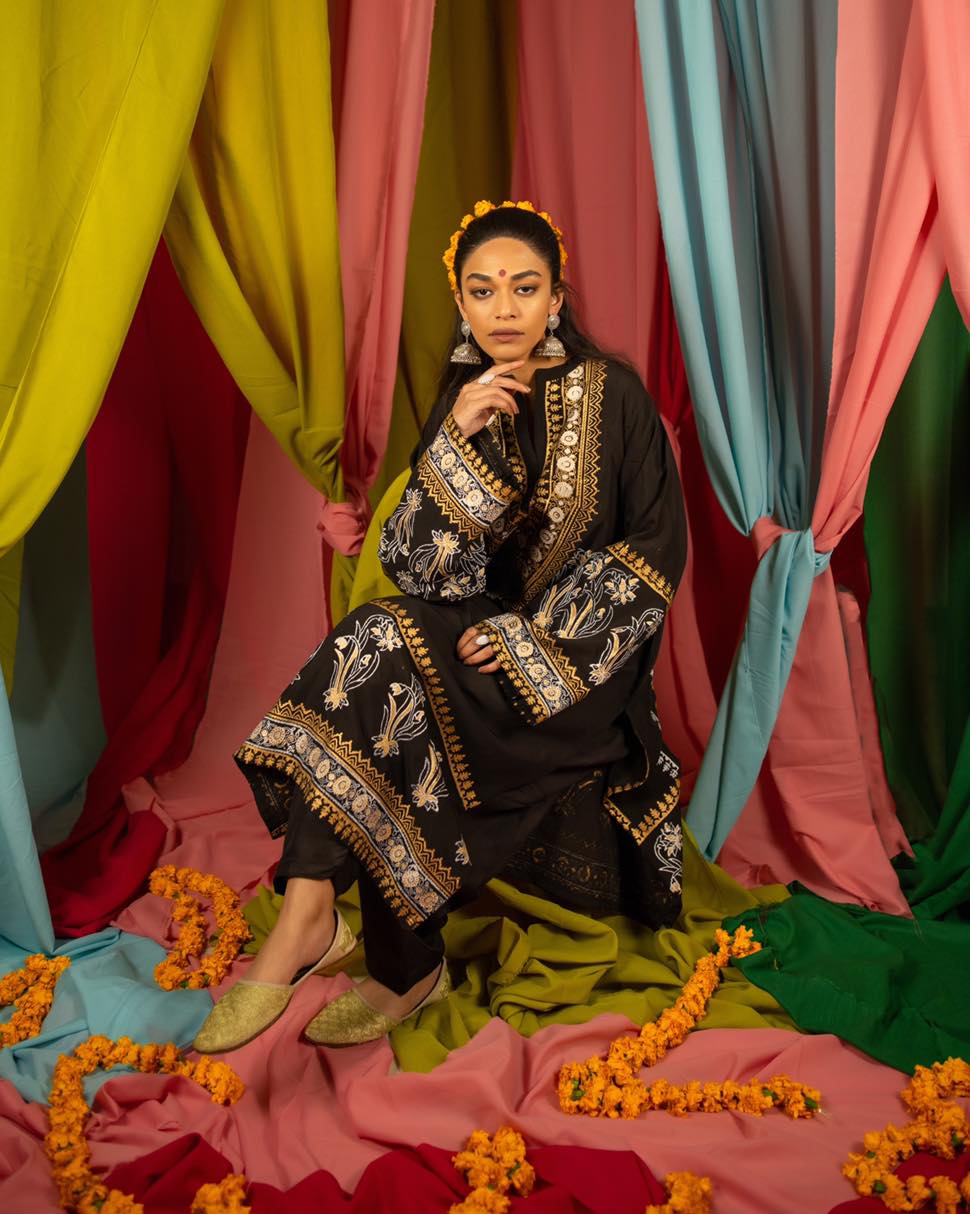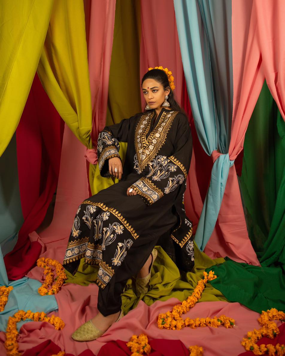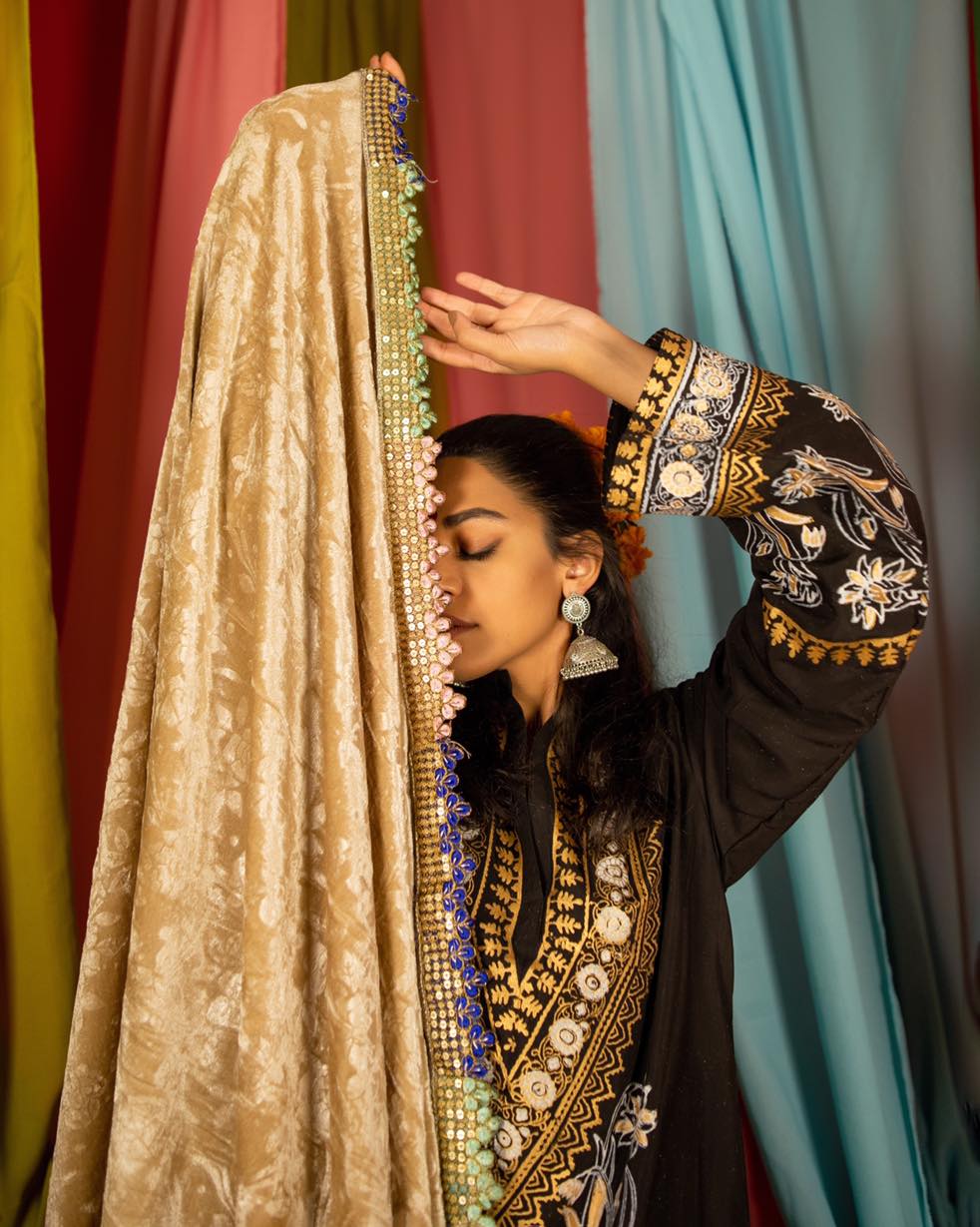 This floral composition is set on black vescose, with intricately detailed off-white and gold hand block printing. It is set off by a sumptuous gold mukhmul shawl edged with zarie sequence and assiduously framed dhaga lace border on all sides. This look is crafted with ultra feminine twists, elevated textures and highly luxurious accents to make you glide through the winter season with greatest of ease.