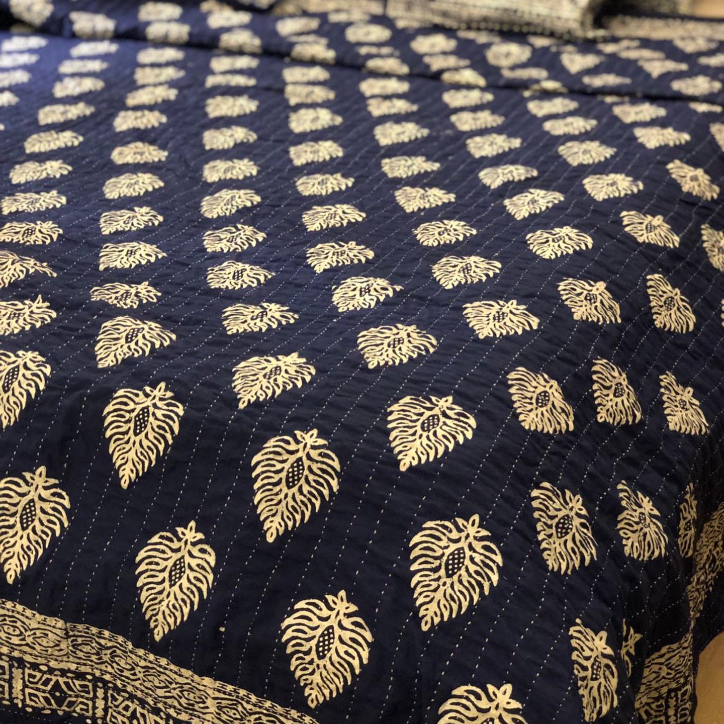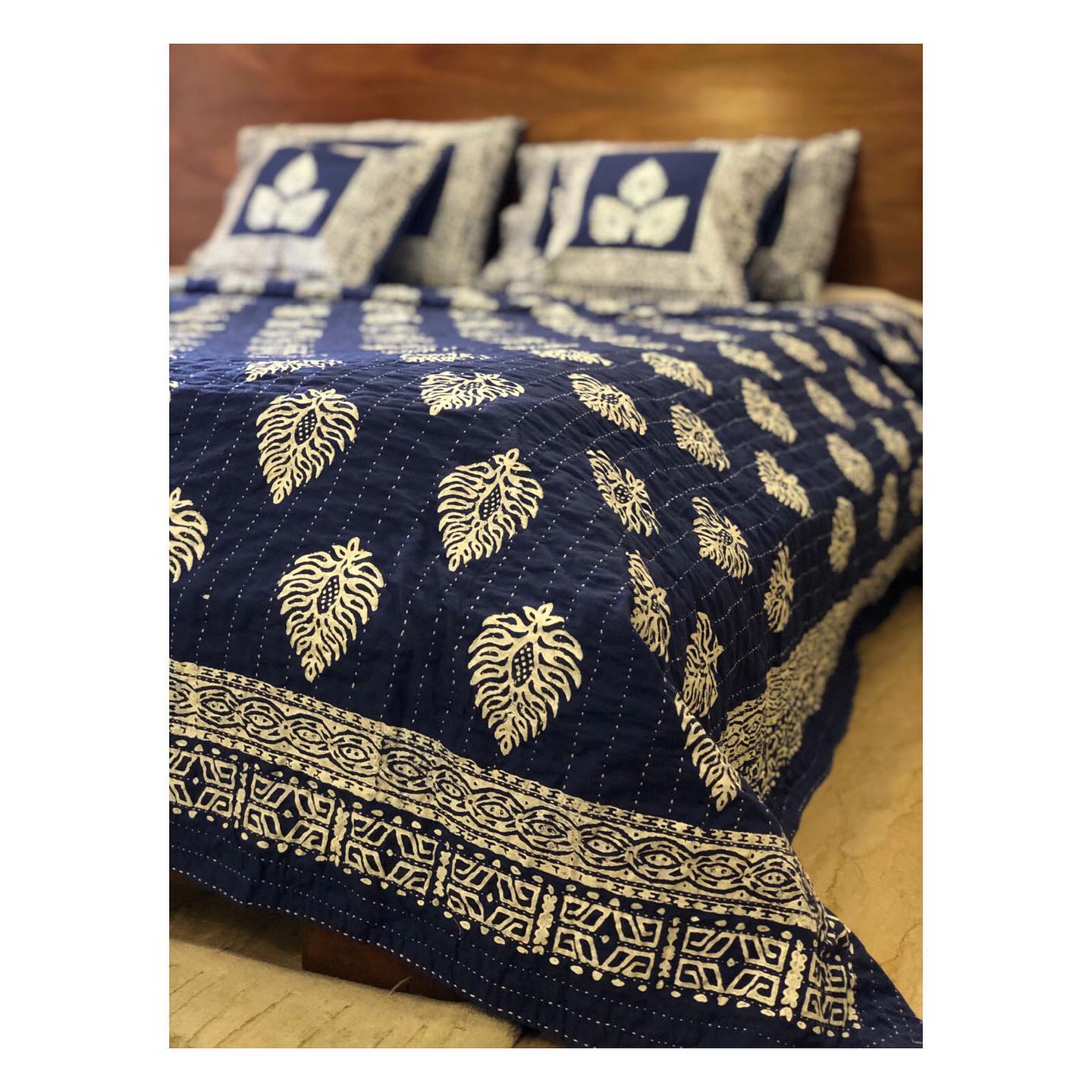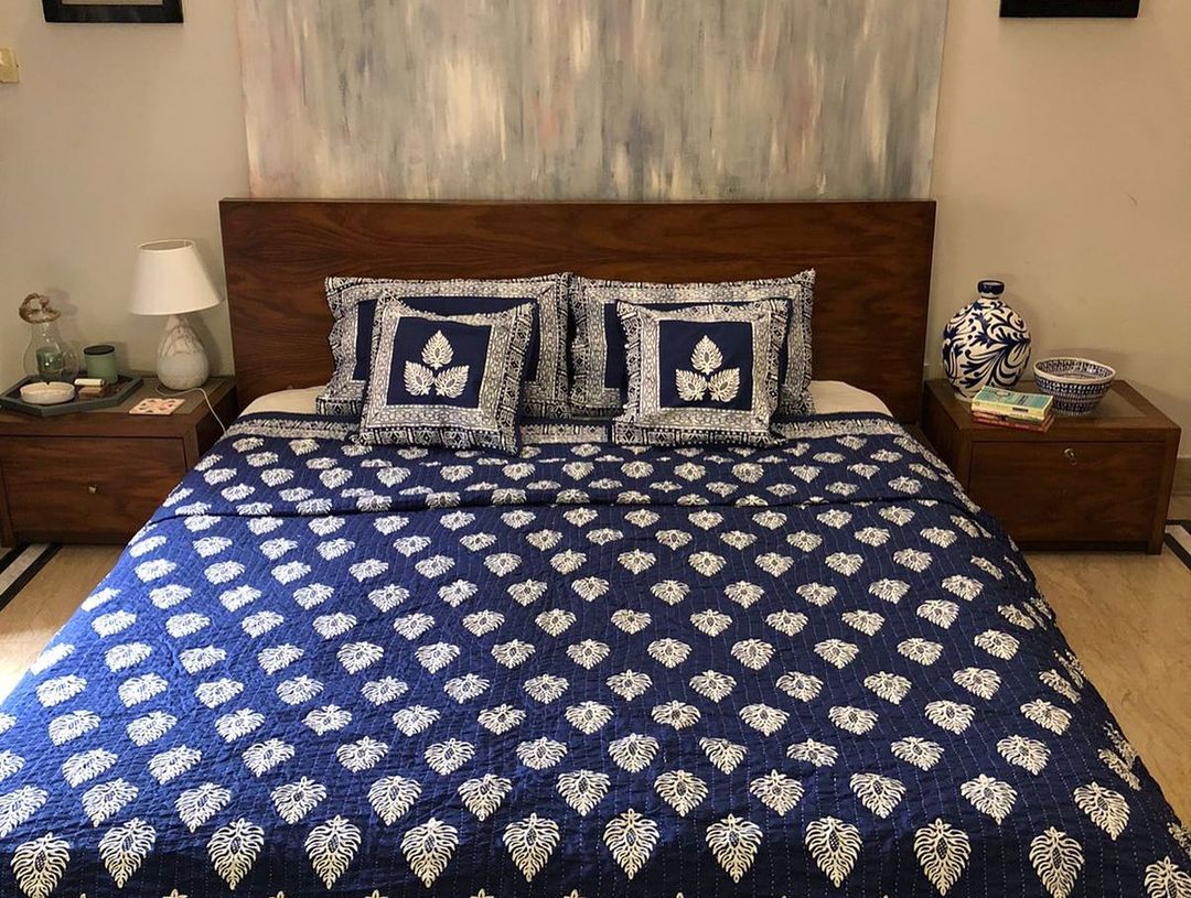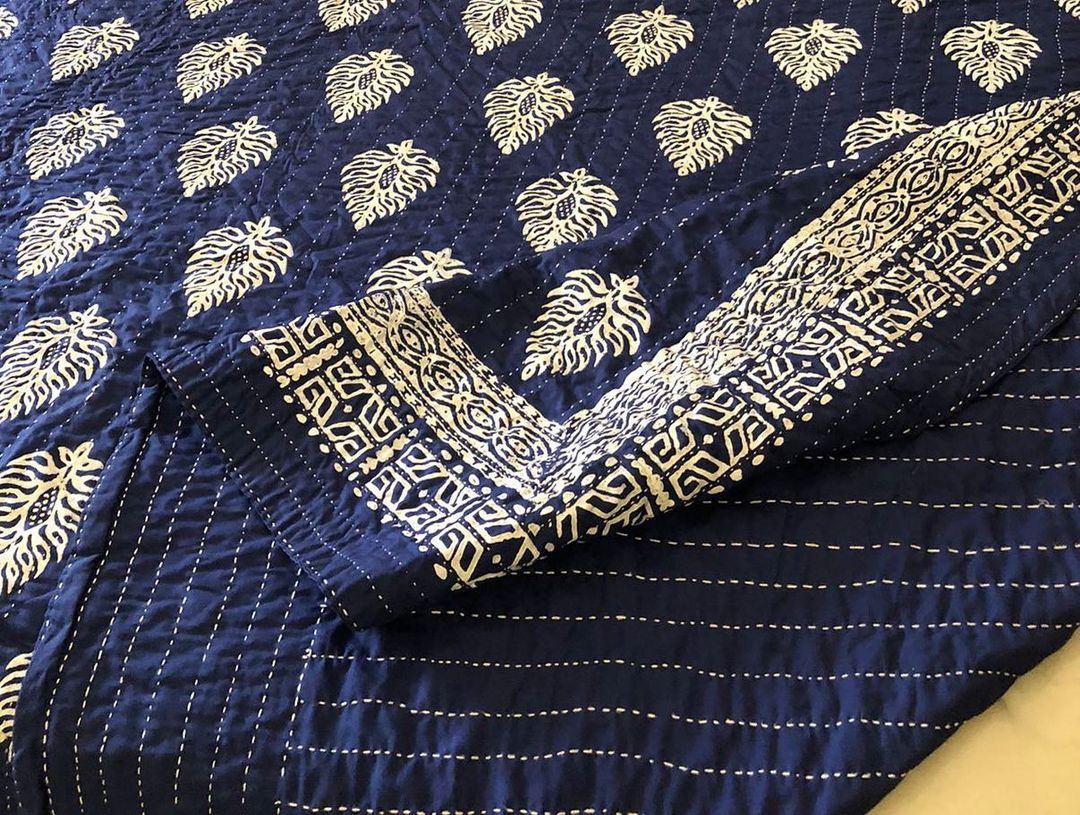 Hand-crafted Kantha Quilts with Block-printing.Complete Set includes-- 2 Pillow Covers- 2 Cushion Covers- 4 Layered King Sized QuiltONLY Single Piece is available for every Design as they’re completely hand-made.