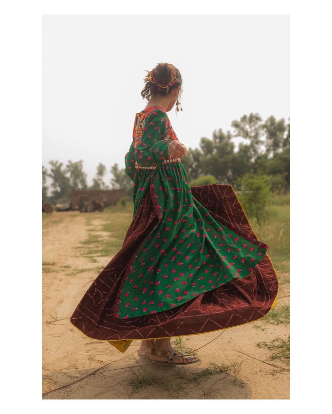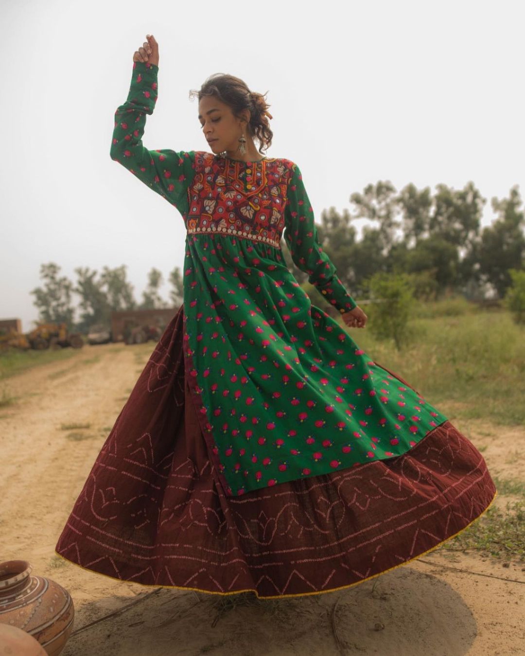 She dances on the flute of love in her Chunri Ghagra and Meenakari Shirt.