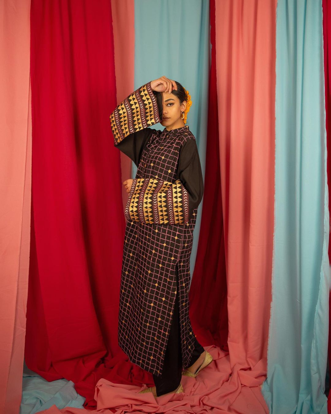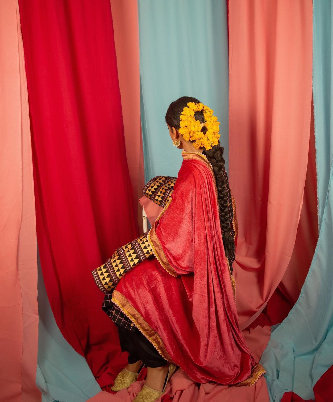 Our dreamy design Mohini is etched with gold and tea pink hand block print on black vescose. Coupled with a pink mukhmul shawl, edged with organza zari patti and gold lace that exuberates luxury.
