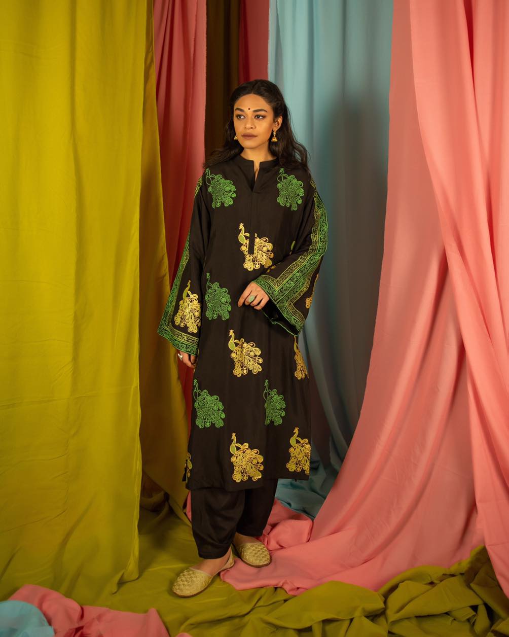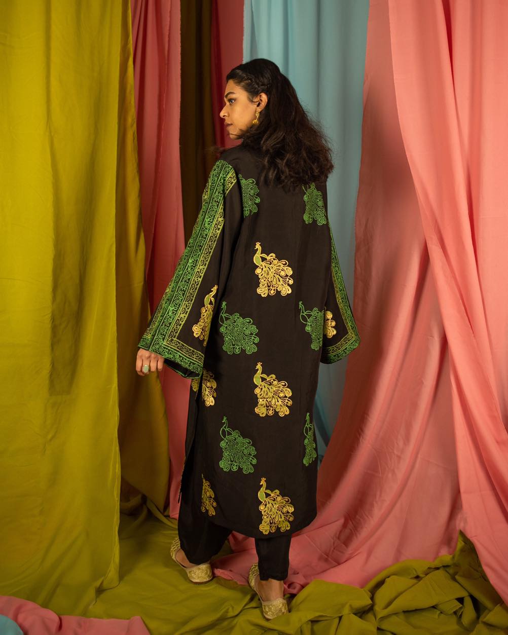 Introducing our next article, Morni. An incandescent, richly detailed hand block printed peacocks on a black vescose straight shirt. Accompanied by a green mukhmal shawl, with green zarie patti and golden lace edging;