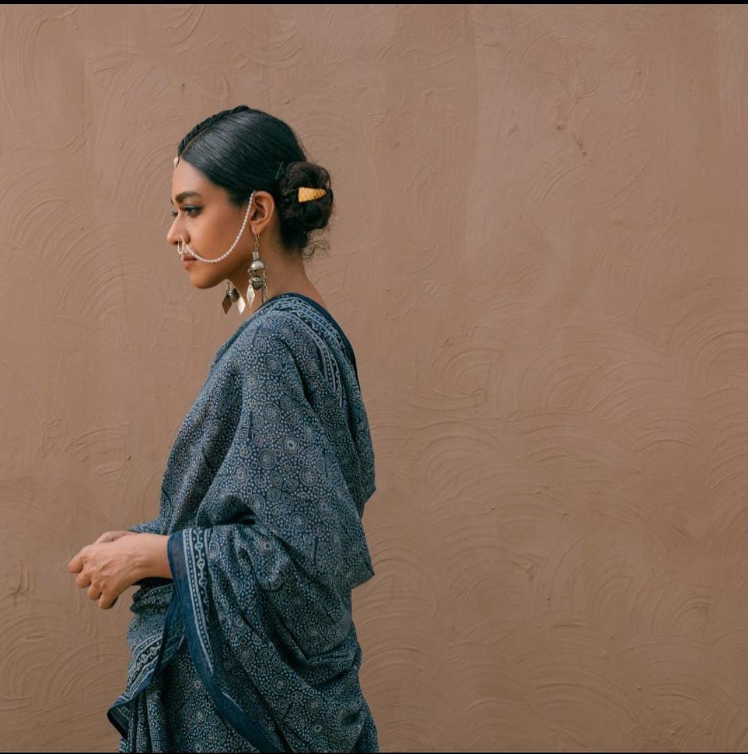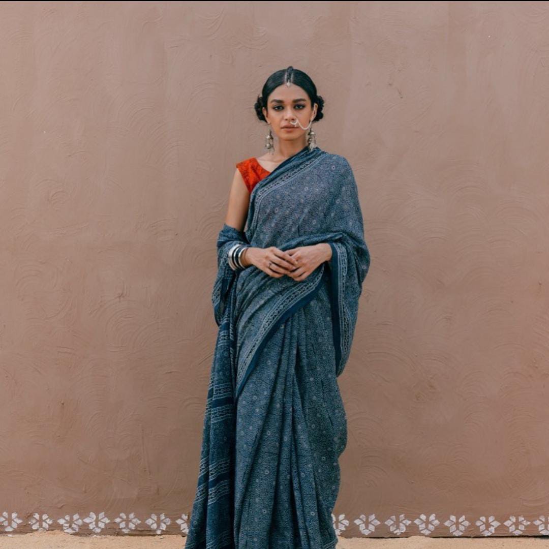 The organic print of Thar on Aegean colored Saree with red Marvi print Blouse representing the vibrant culture of the region