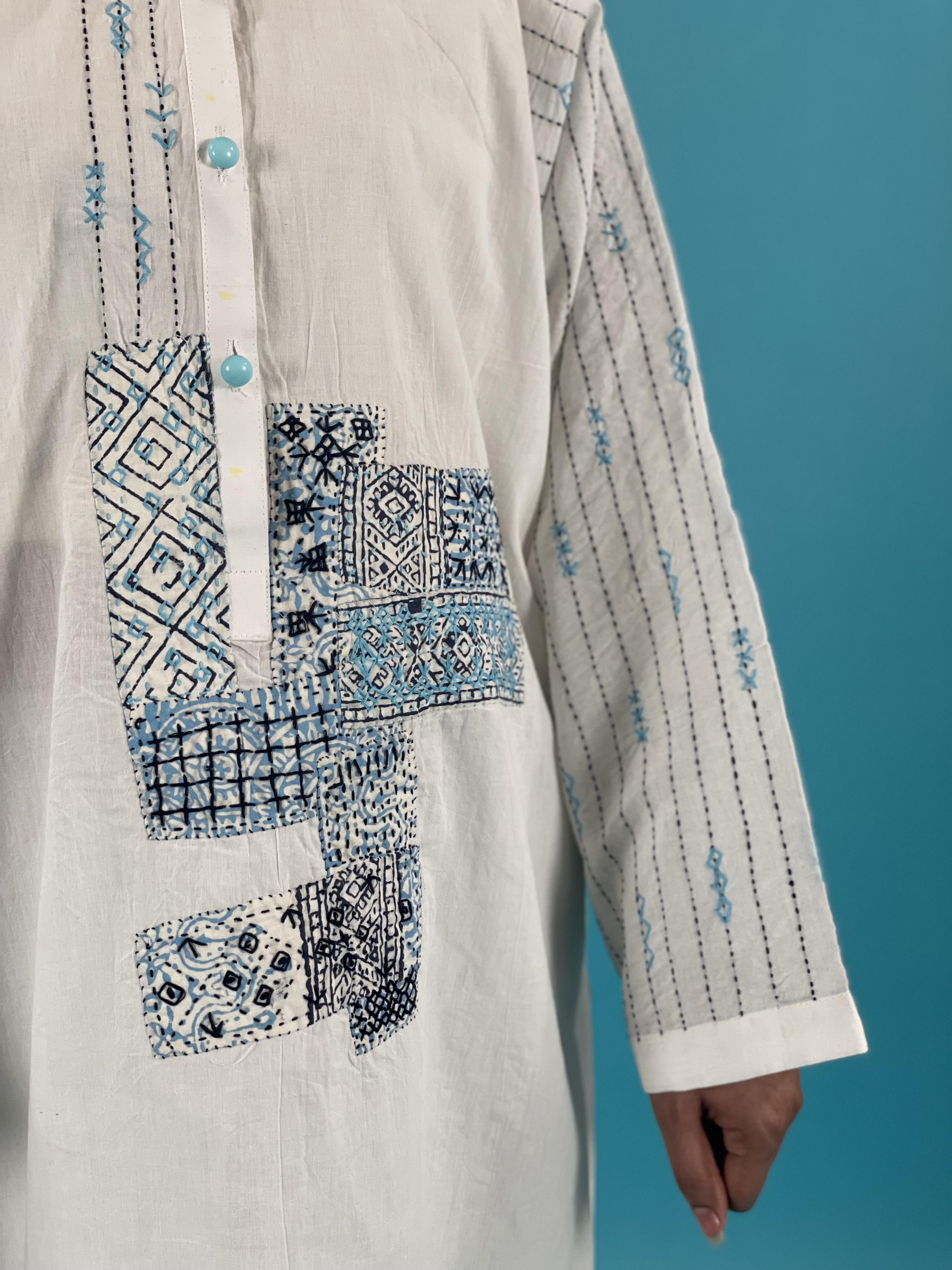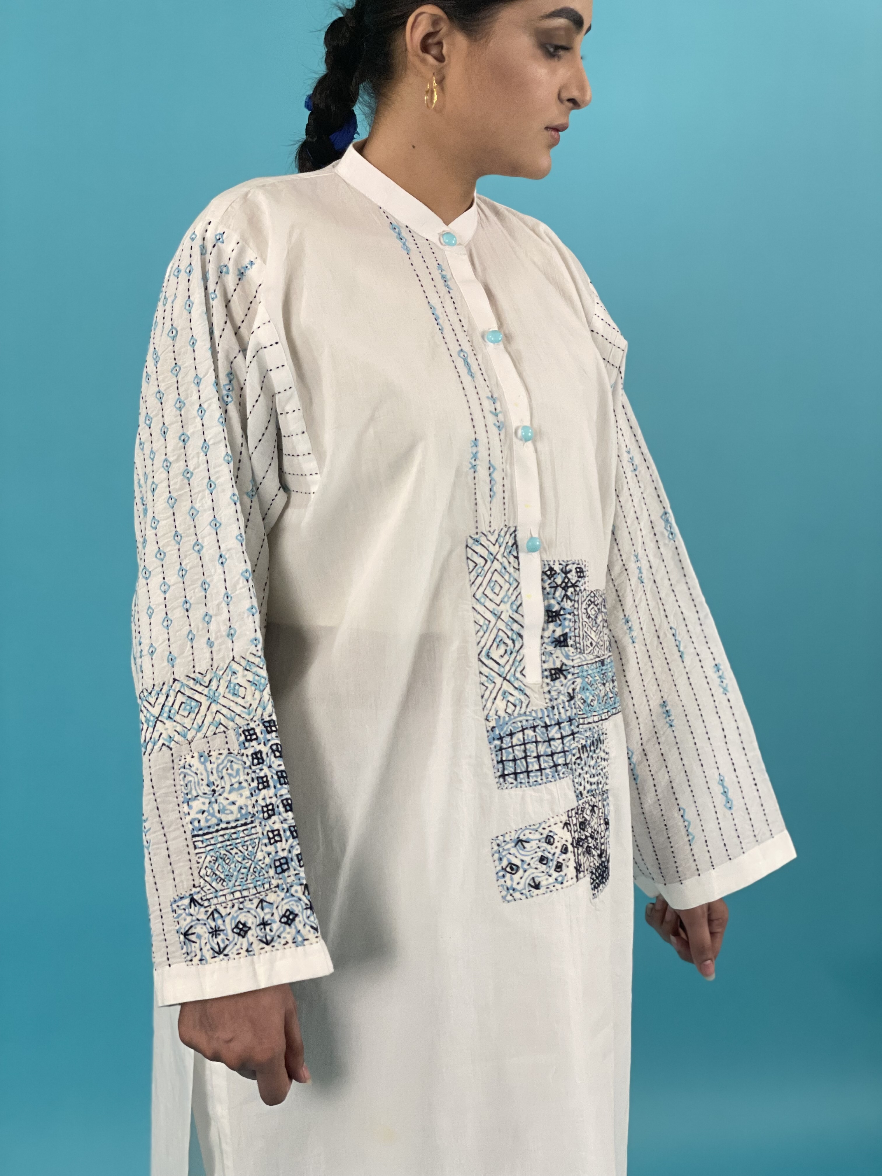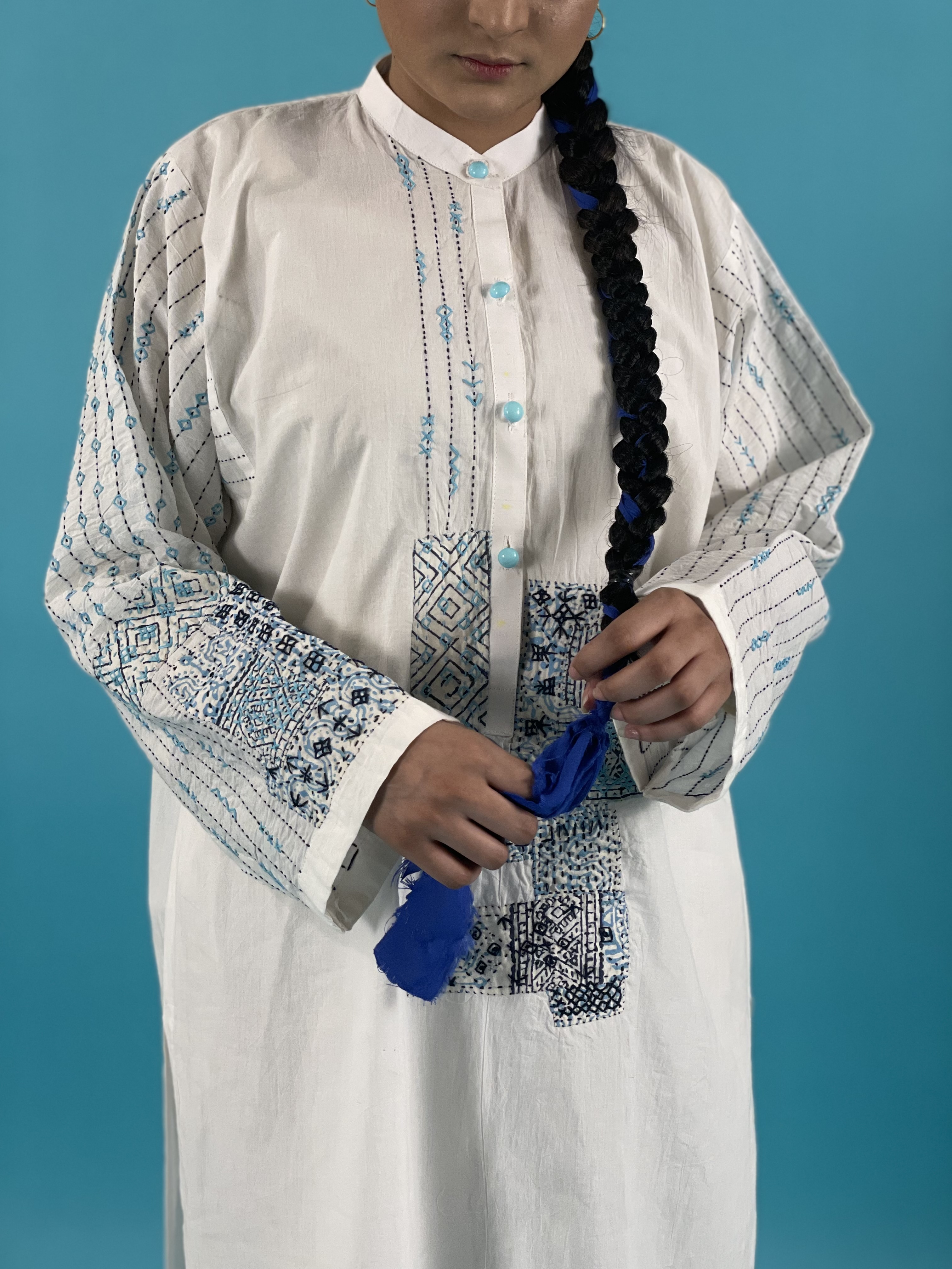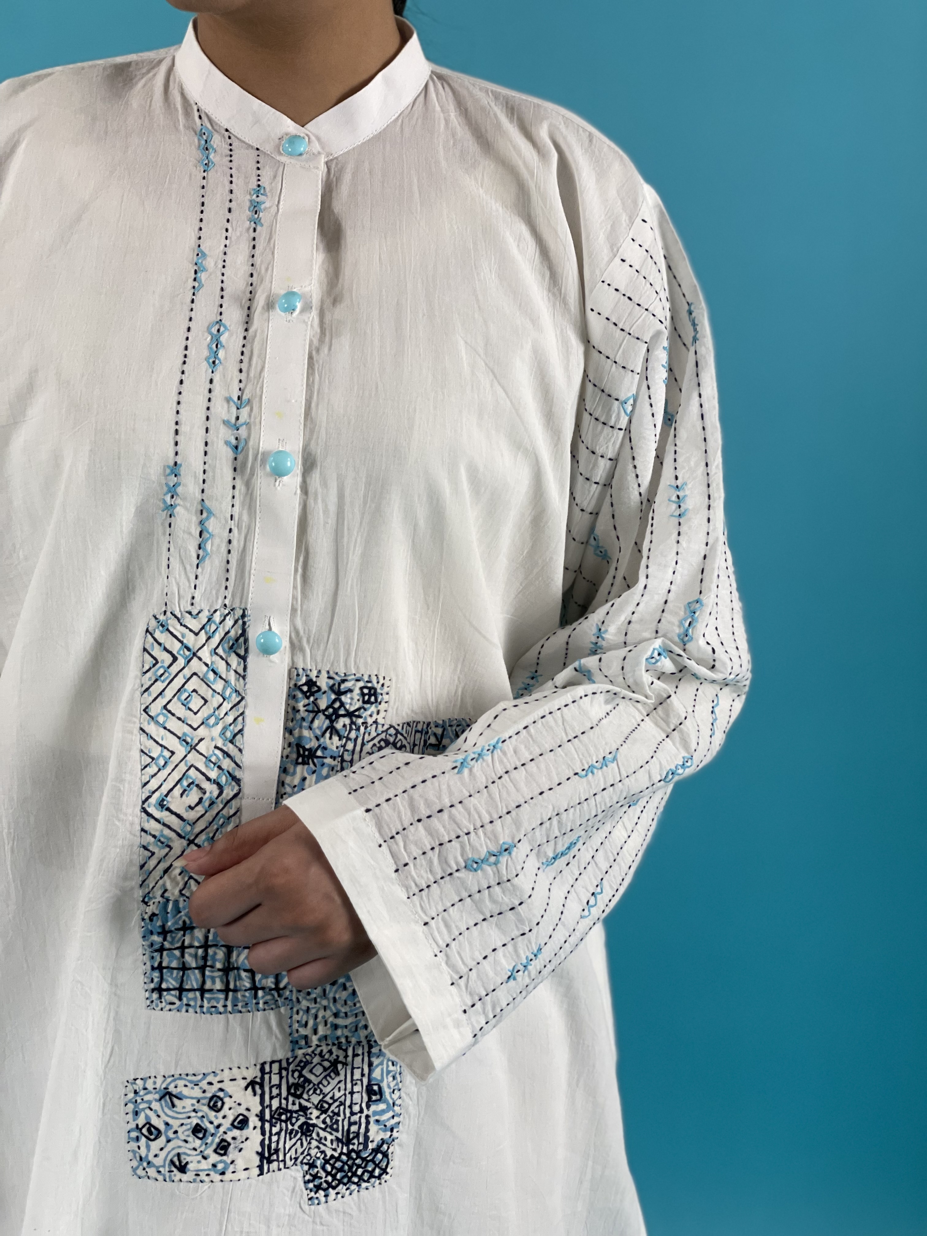 Presenting our new shirt! White pure khaadi shirt with block print and different stitch of kantha with patchwork.Made with love & purely handmade work by different artisans from all over Pakistan.