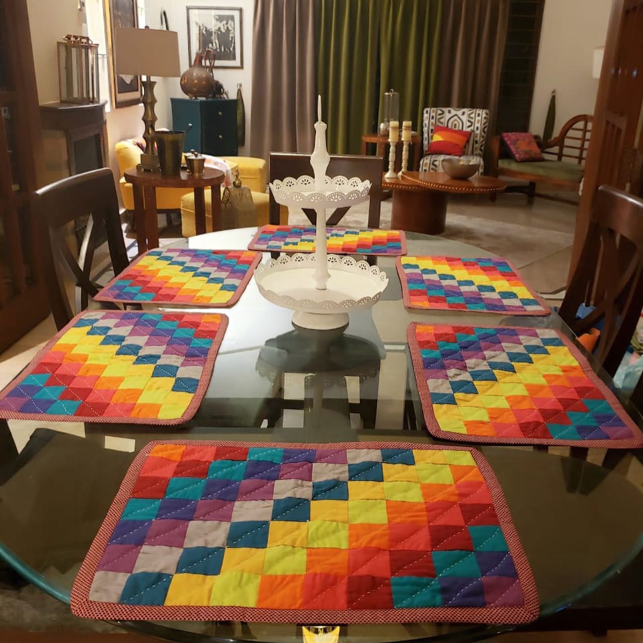 A distinguishing feature of ralli patterning in patchwork made from pi...A distinguishing feature of ralli patterning in patchwork made from pieces of cloth with diagonal placement of similar blocks cut into squares and triangles and then stitched together. These table mats represent an Individual expression and spontaneity of colors within the traditional patterns....See moreSee less