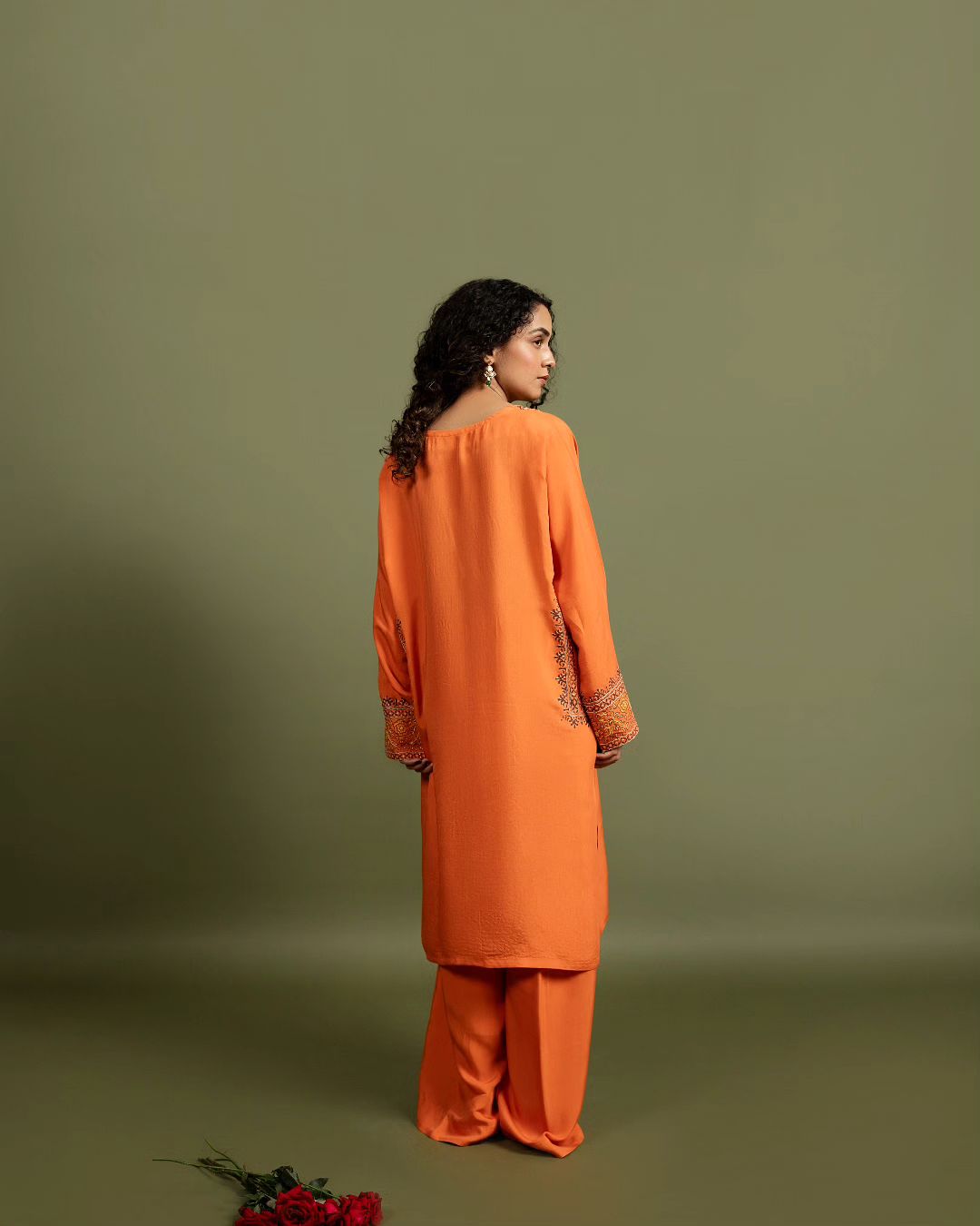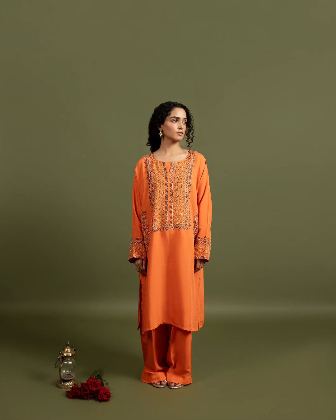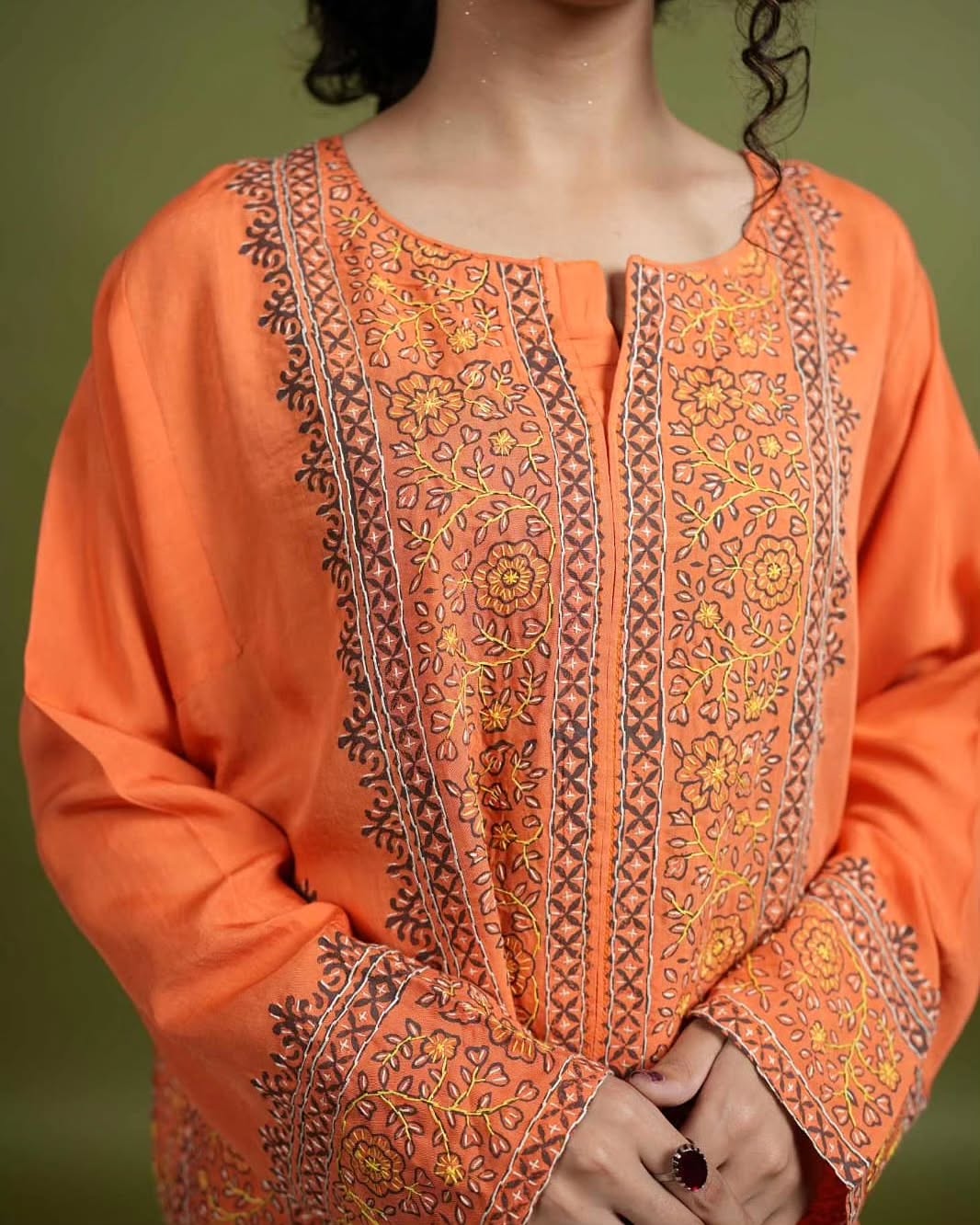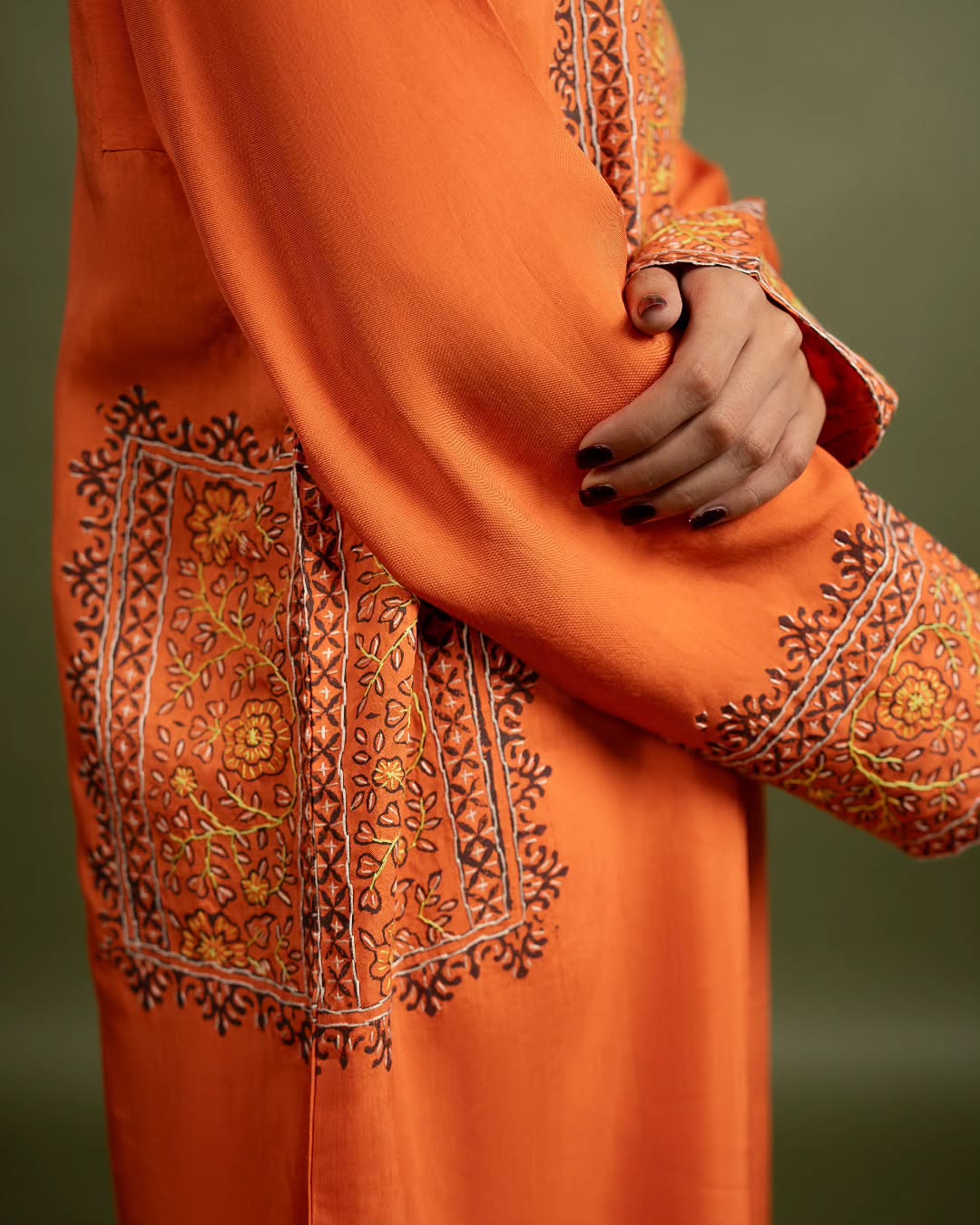 This shirt and trousers set is crafted from soft viscose fabric, ensuring comfort and breathability. The shirt features exquisite block printing combined with intricate Kashmiri kadhai embroidery, adding a touch of elegance and heritage. Functional side pockets are adorned with delicate block-printed details, merging utility with style. Perfect for effortless everyday wear with a hint of tradition.