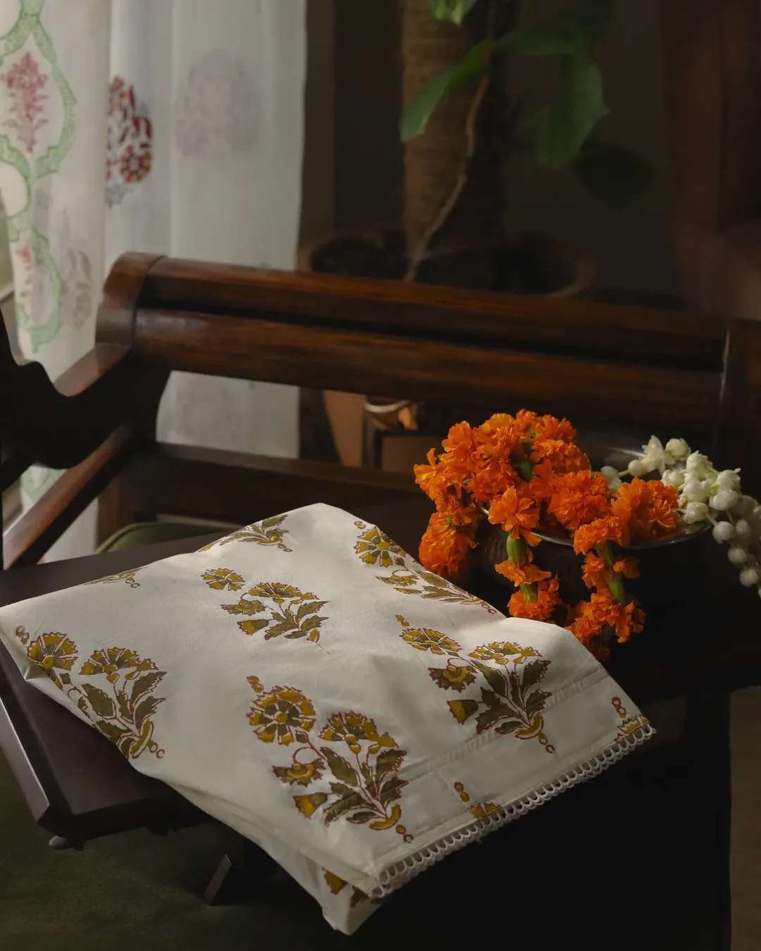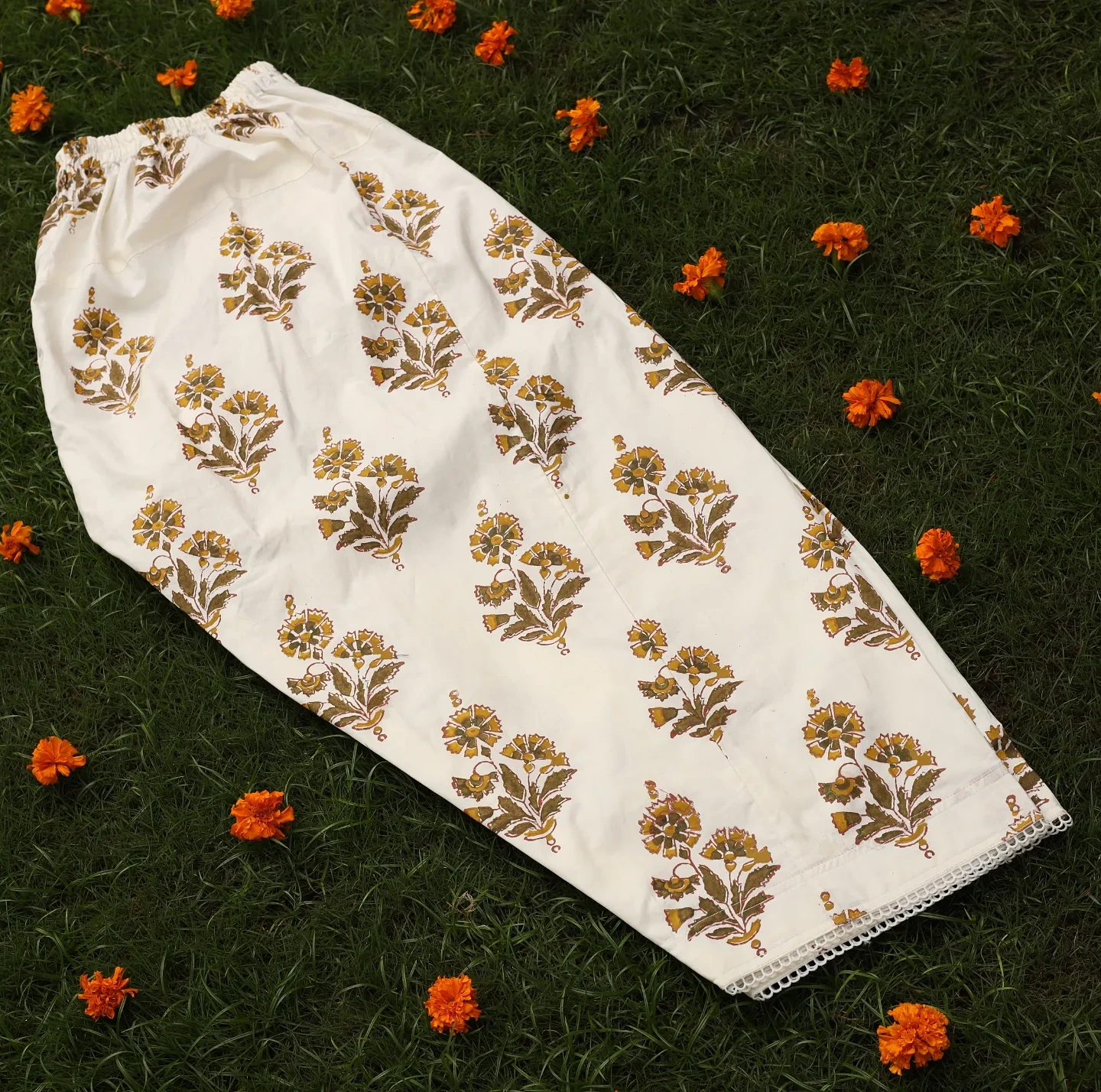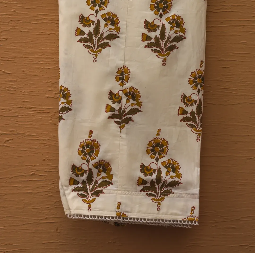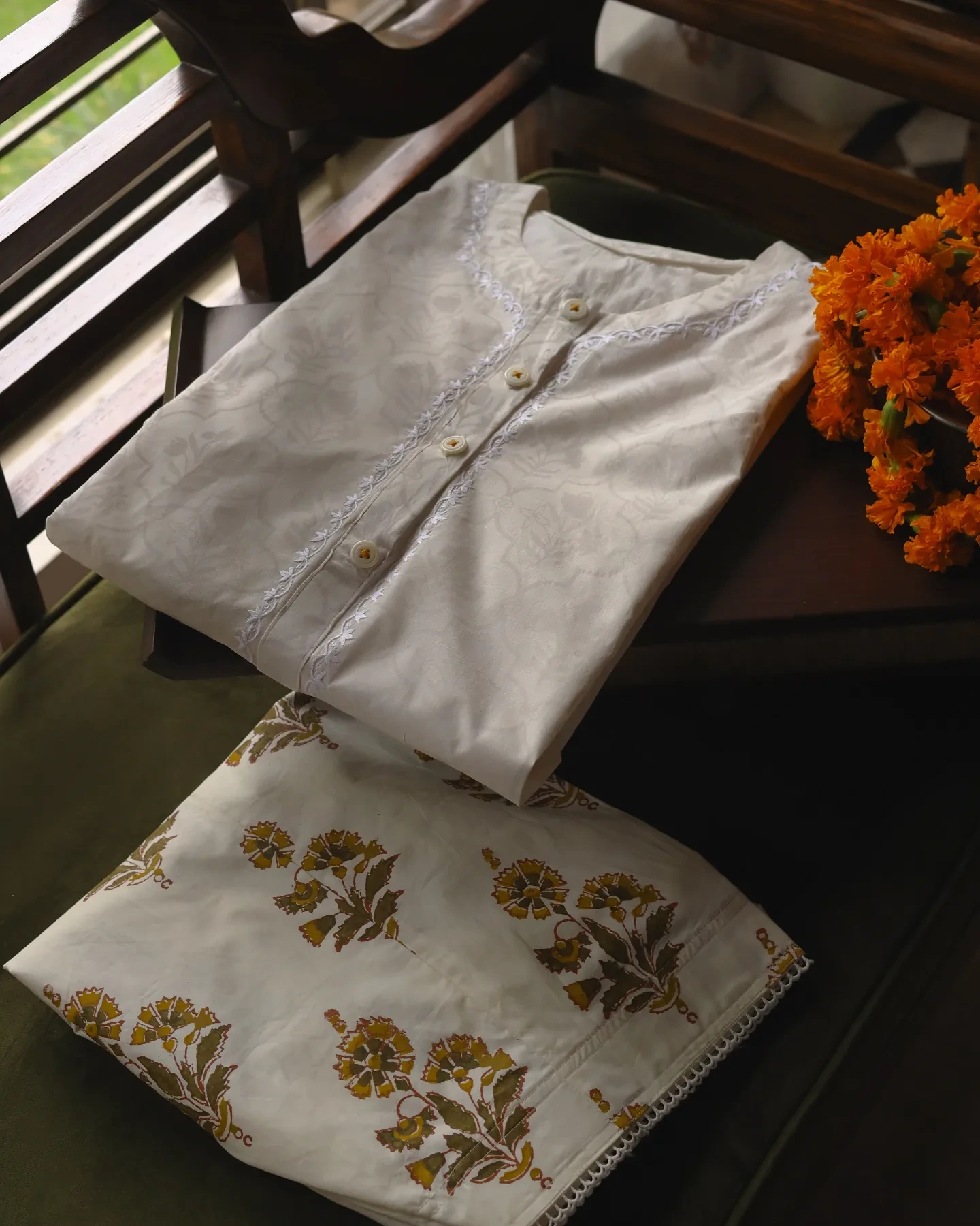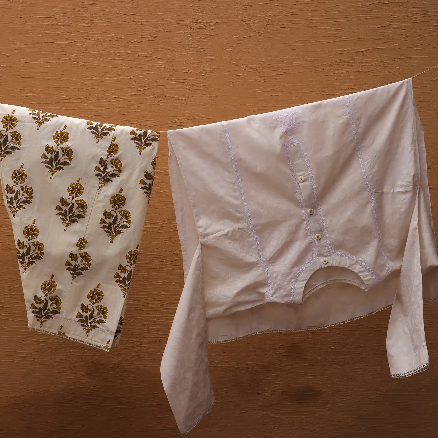 In honor of a life so bright, we present a tribute wrapped in white. Each kurta, hand-embroidered with care, tells tales of joy and love rare. Adorned with screen-printed grace, it captures her radiant embrace. Paired with salwar, in hues organic and true, a block-printed dance of colors anew. Celebrate her spirit in every thread, where her legacy and our dreams are seamlessly spread.