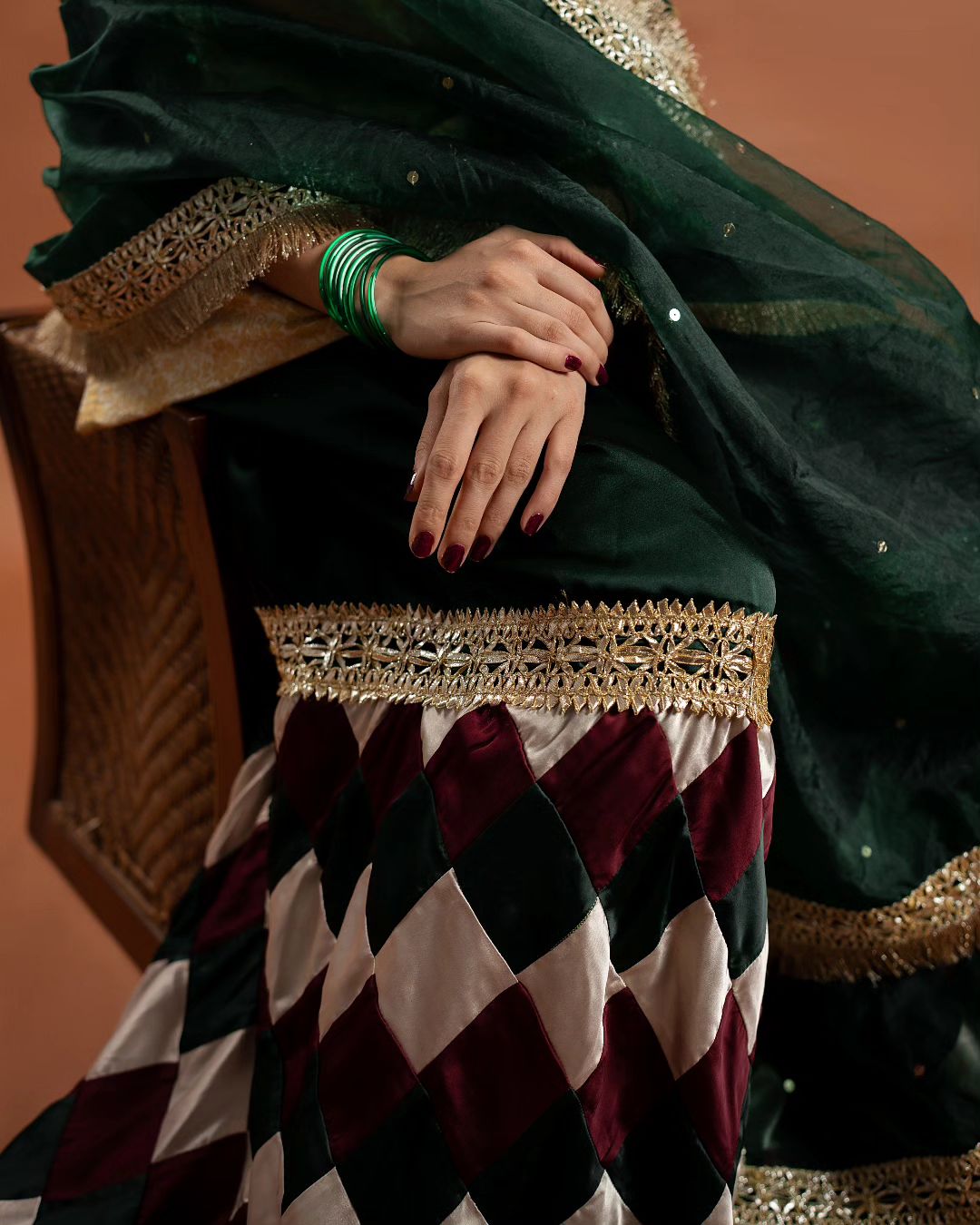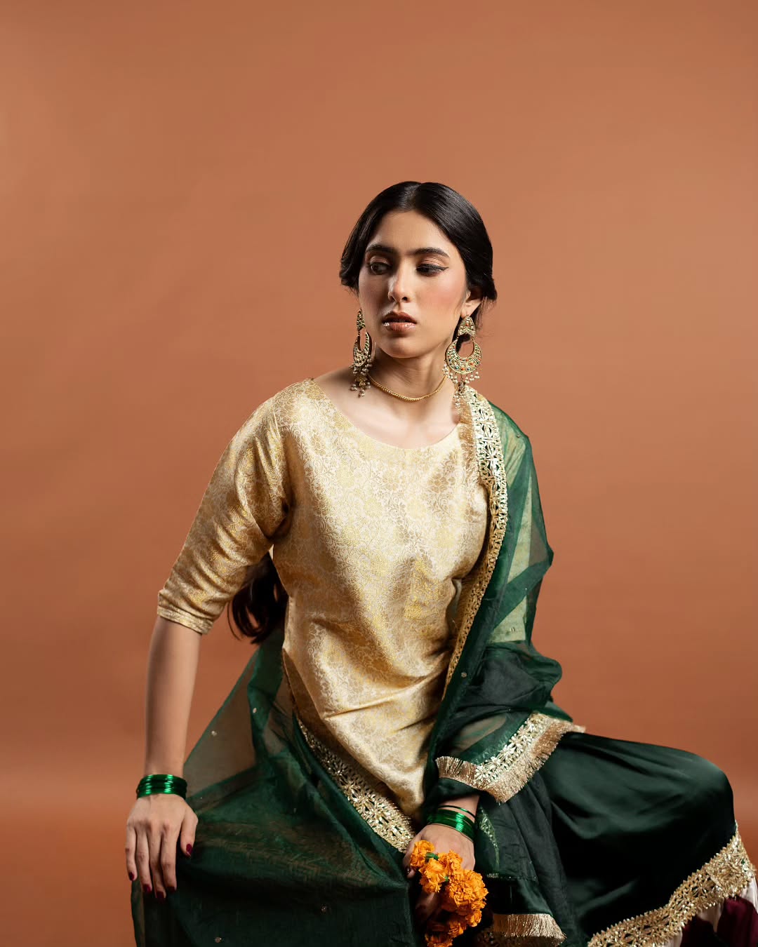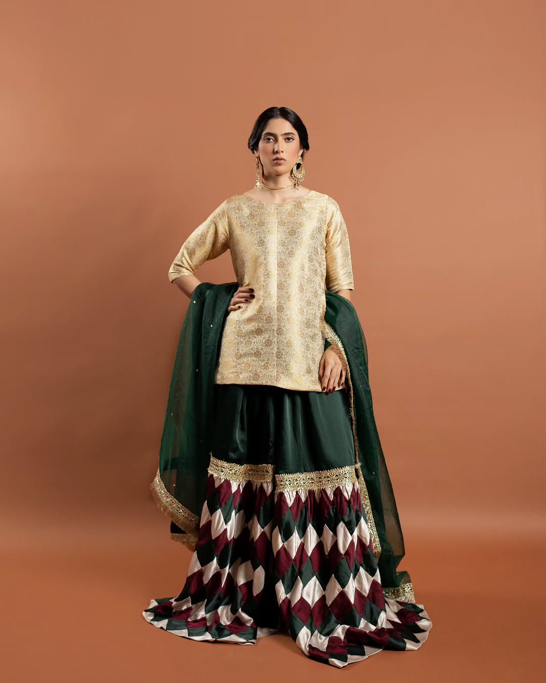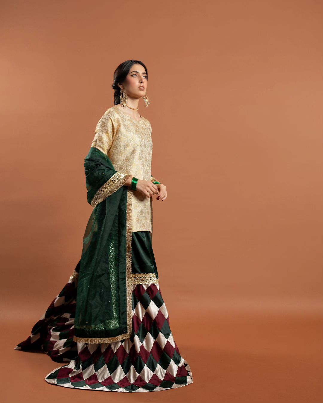This breathtaking farshi gharara is a celebration of elegance, crafted from lustrous satin silk with intricate chatta patti accents and shimmering gota embellishments. Paired with a soft organza dupatta adorned with sparkling sitara and edged with classic kiran, it creates a look of refined charm. The luxurious jamawar shirt adds a final touch of opulence to this timeless ensemble.