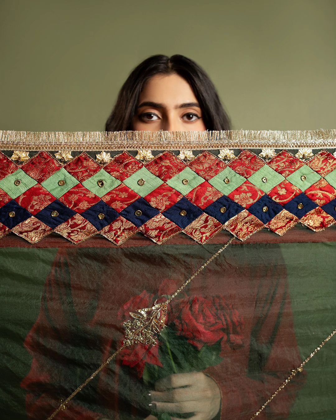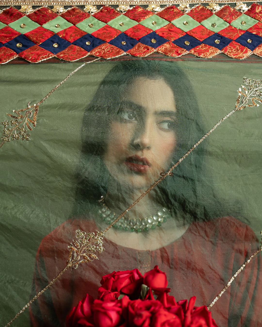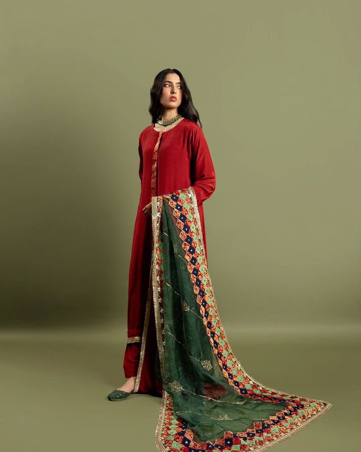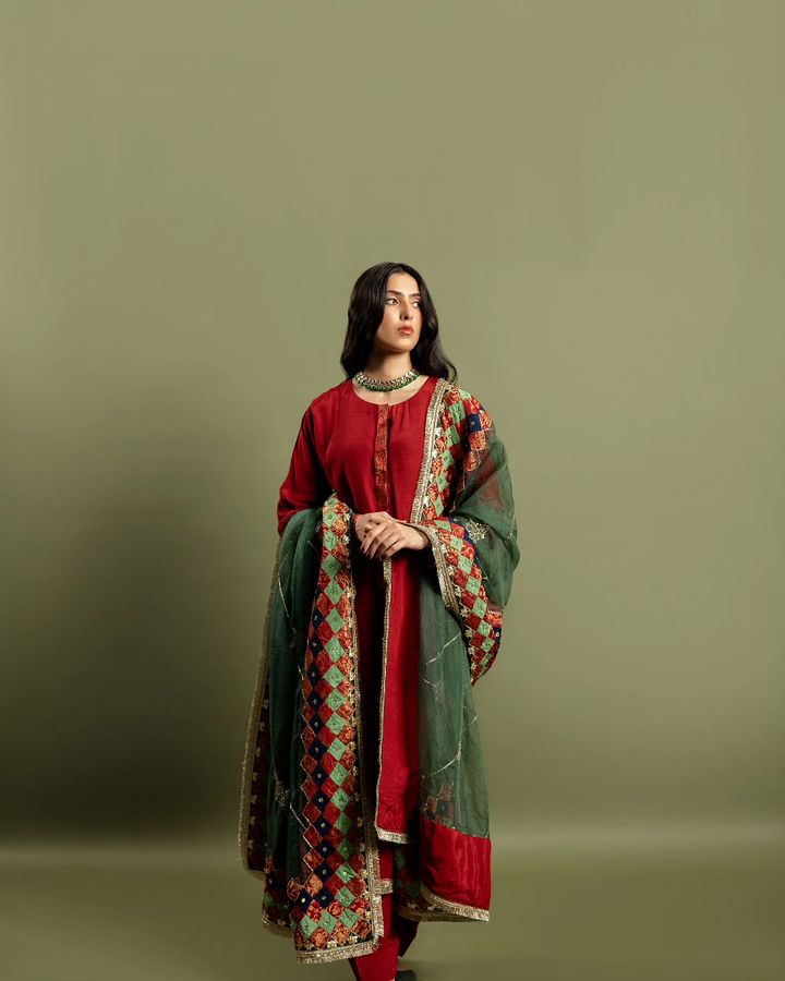 Wrap yourself in timeless charm with our raw silk shalwar kurta and a green organza dupatta, adorned with Salma Sitara, naqshi, and gotta detailing. Each patch of Jamawar and silk tells a story, completed with delicate kiran edging.
