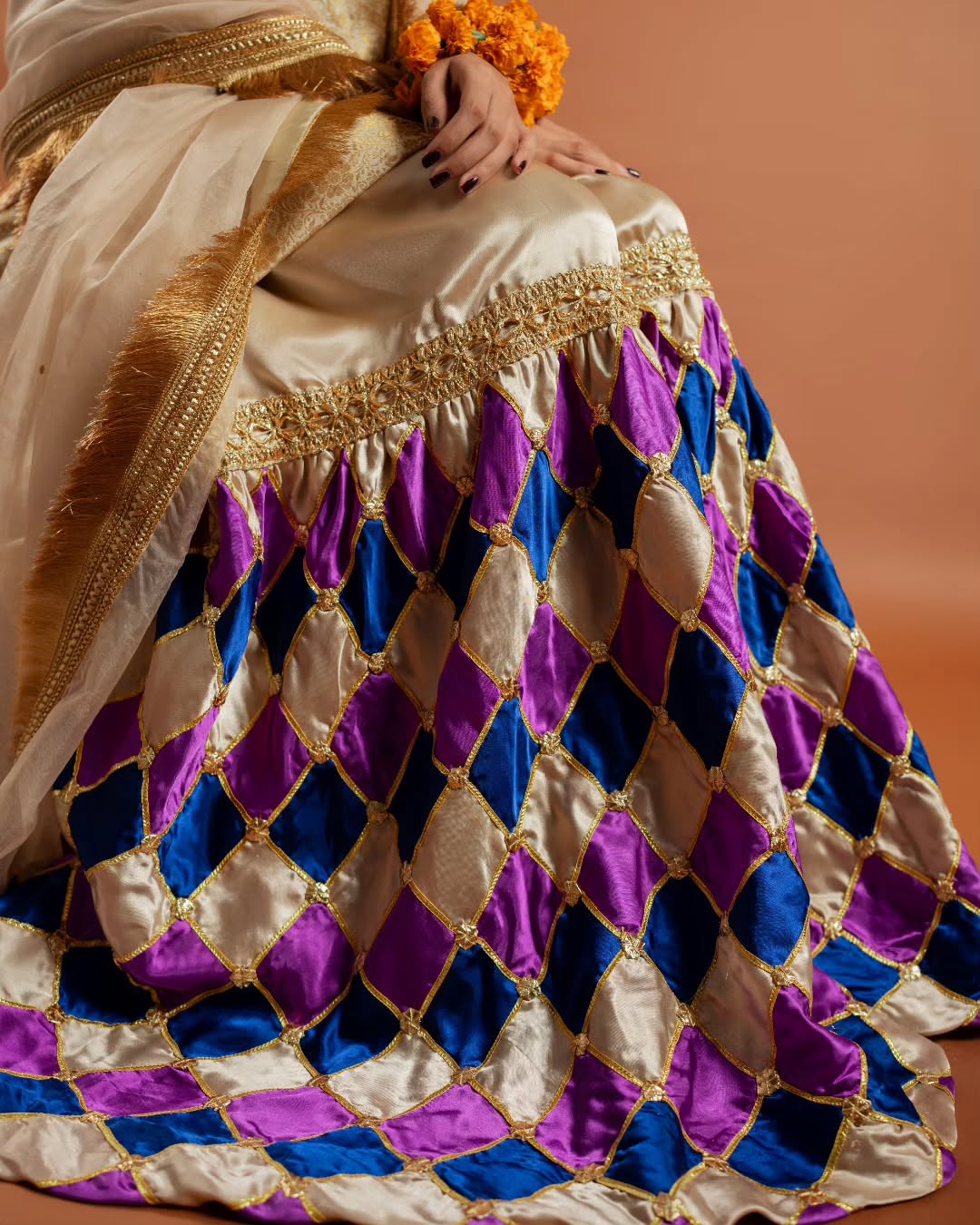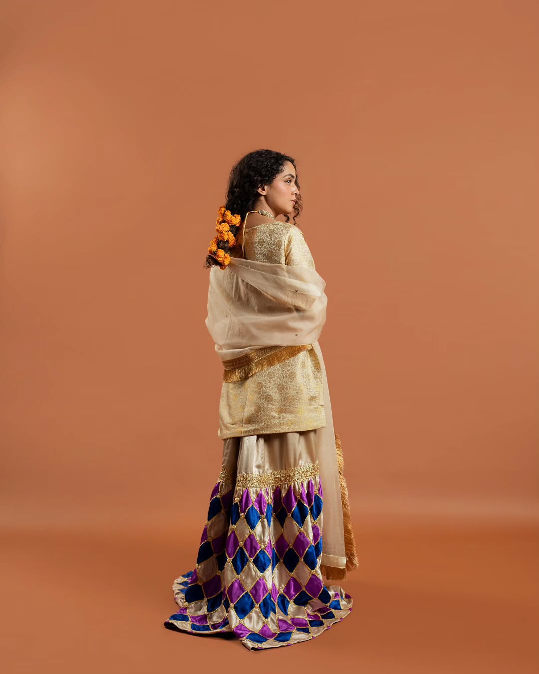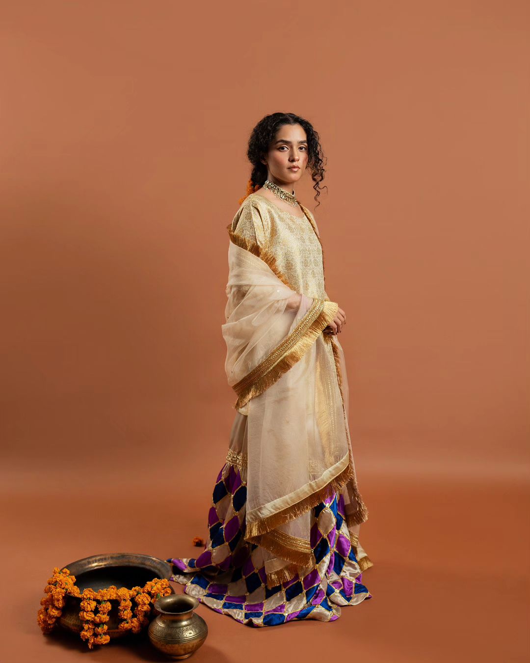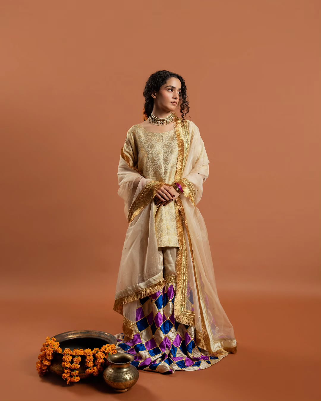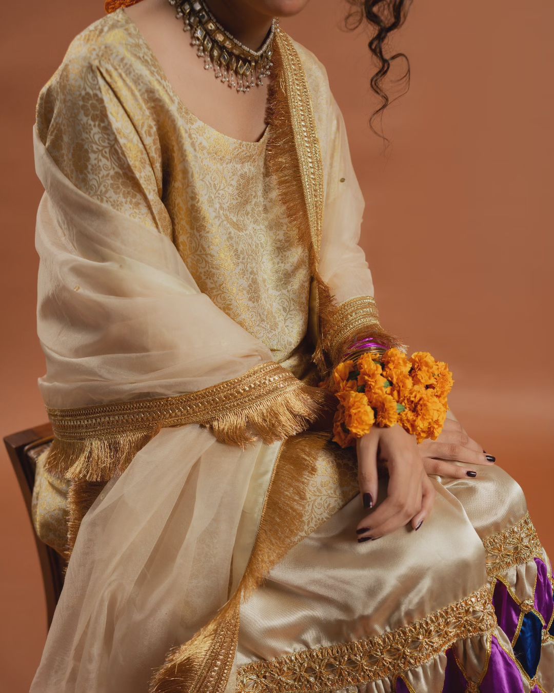 This satin silk farshi gharara is a testament to timeless craftsmanship, adorned with intricate chatta patti work and shimmering gota embellishments. It pairs beautifully with a sheer organza dupatta, embellished with delicate sitara and kiran, while the luxurious jamawar shirt completes the look with regal finesse. Every detail celebrates elegance and grace.