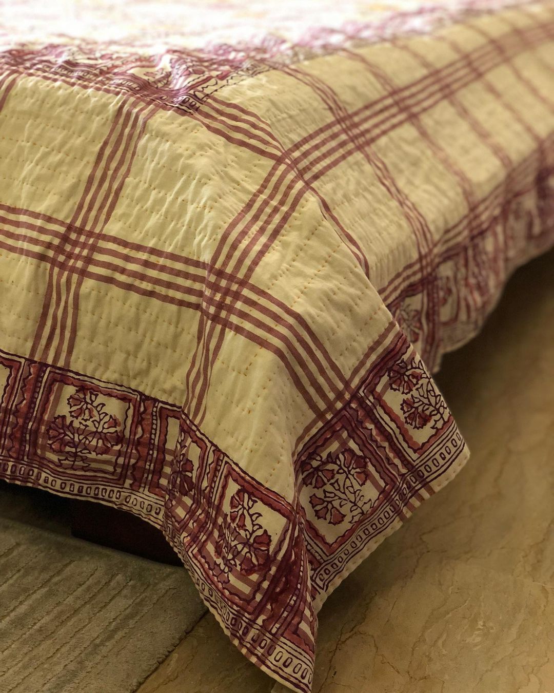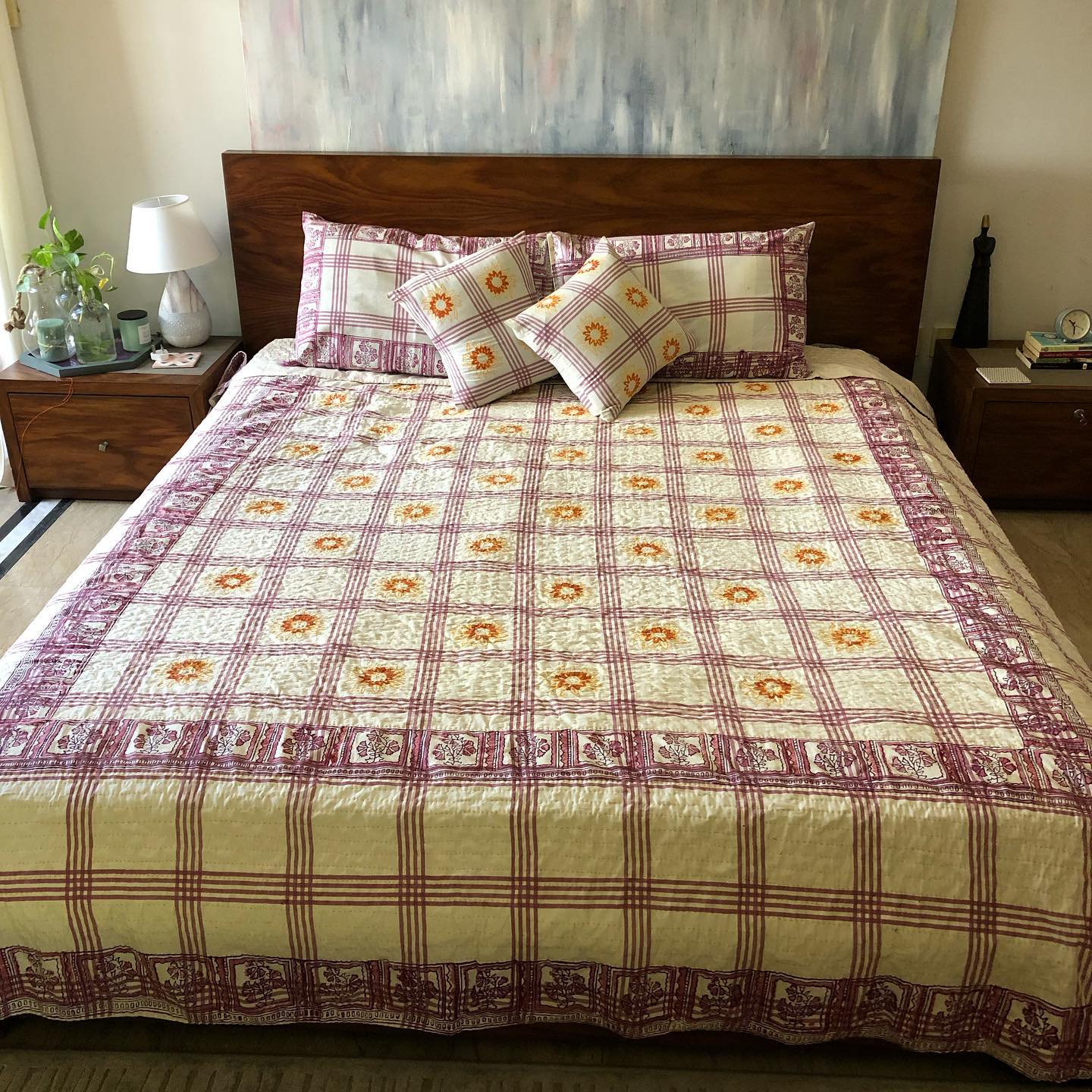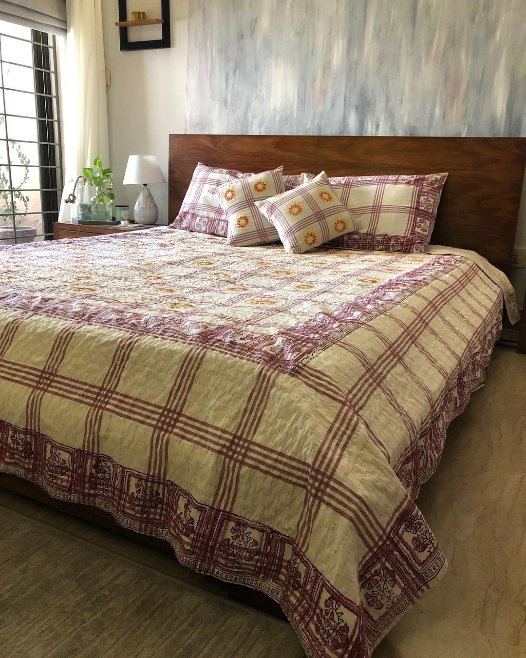 Kantha Quilt with Block PrintingSize - QueenComplete Set with two Cushion and two Pillows