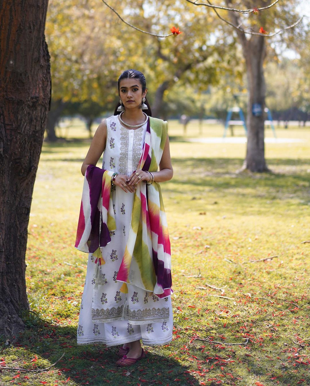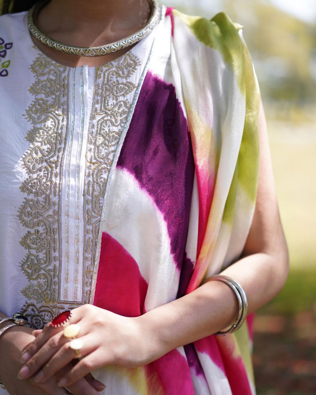 Snow White block-printed Sleeveless Shirt. Aazar embellished with Silver Gold Gota’ Kinari and Tilah embroidery on gala and ghair. Chatta Patti Silk Dupatta decorated with Gotta and Tassels. Bringing the Colours of Eid this season.