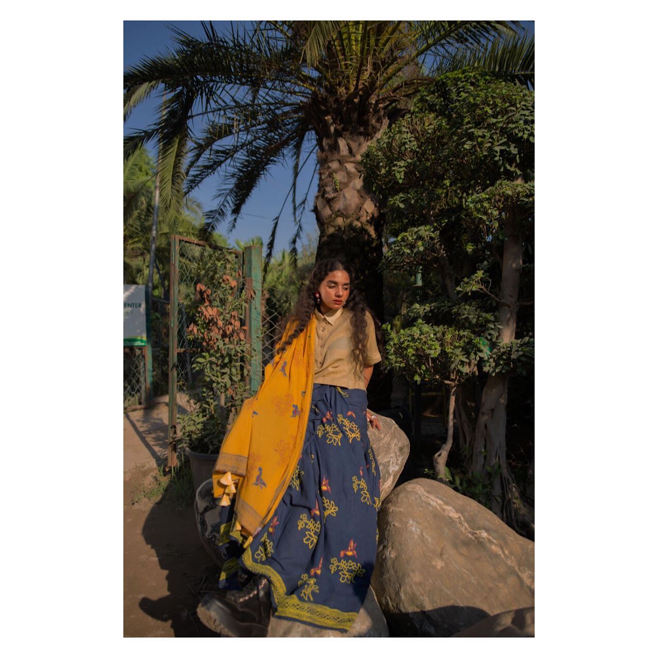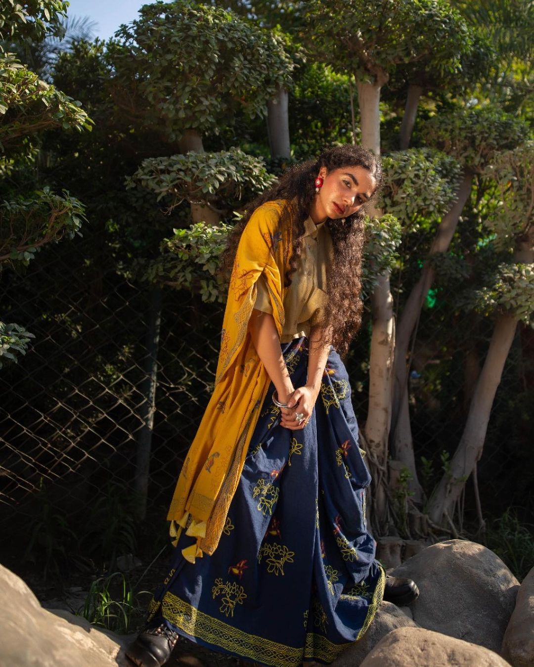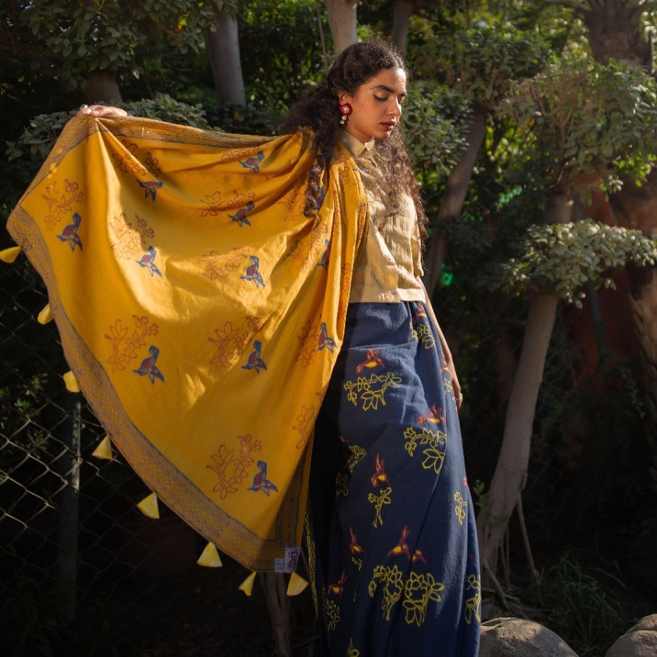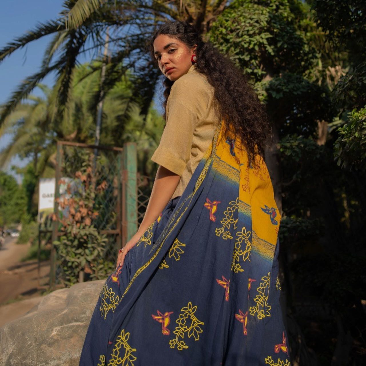 Dove Block-Printed Saree with transition from Blue to Yellow on the pa...Dove Block-Printed Saree with transition from Blue to Yellow on the pallu....See moreSee less