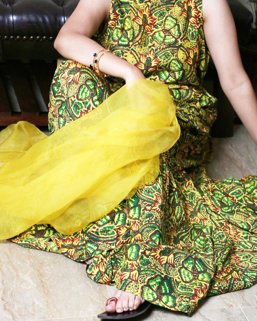 This bright and exquisite set is the perfect addition to your wardrobe of any season. It is carefully curated with a vescos block printed gharara shirt and an organza dupatta to give you a formal yet elegant appearance.
