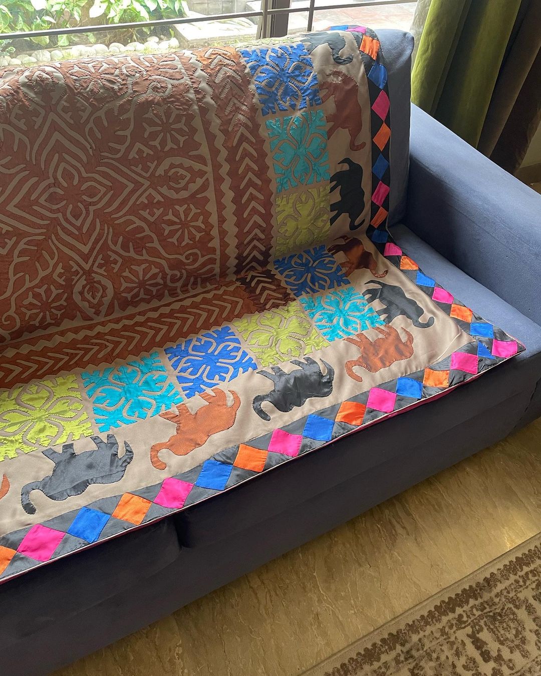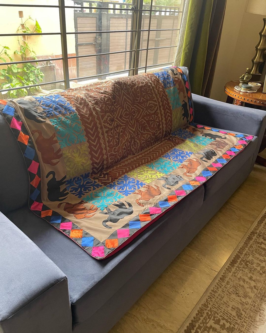 An intrinsic hand crafted tapestry, designed beautifully in multi colored complex patterns, further adjoined together to create this ralli masterpiece. It can also be used as a sofa thrower, table cloth and other multiple purposes.