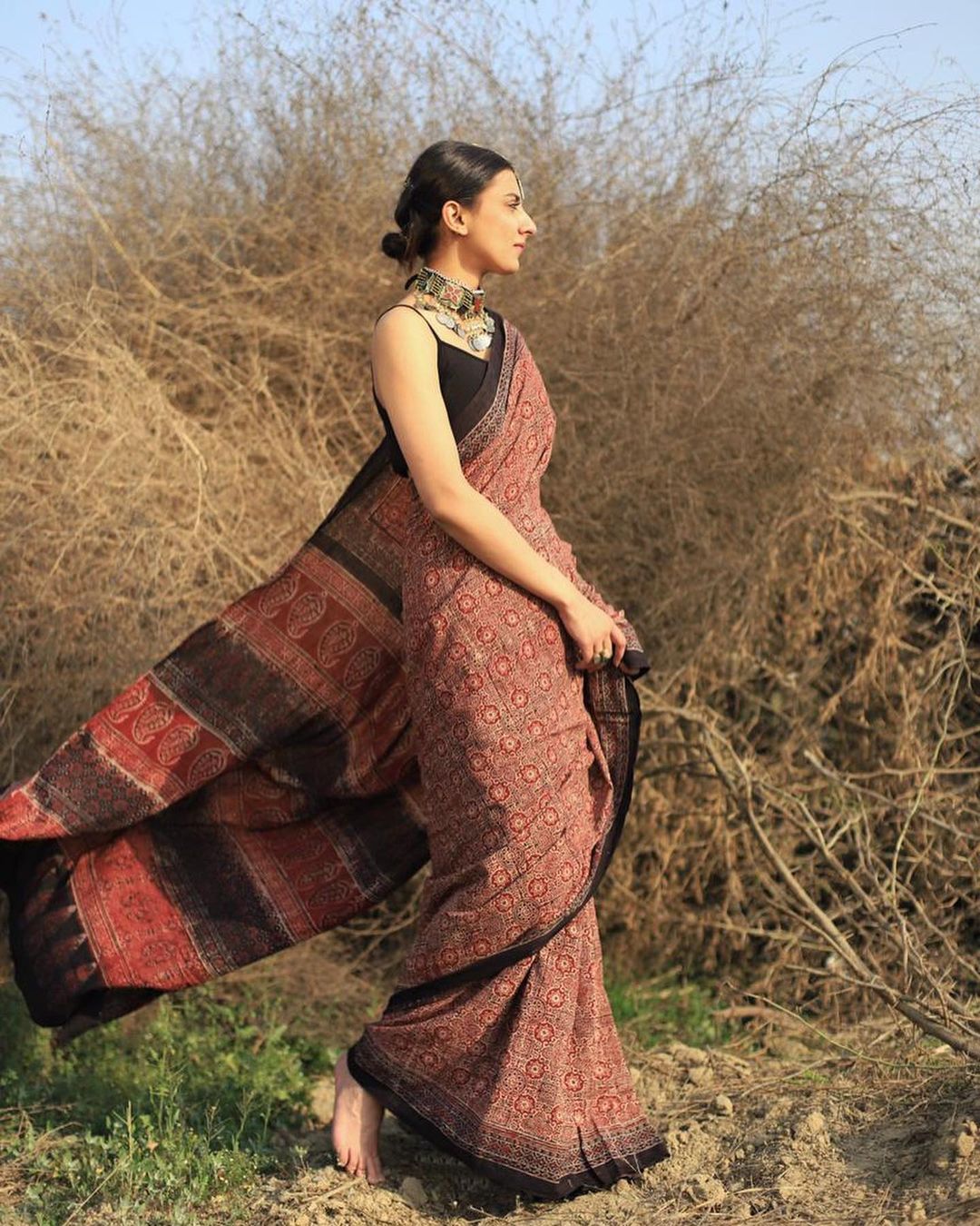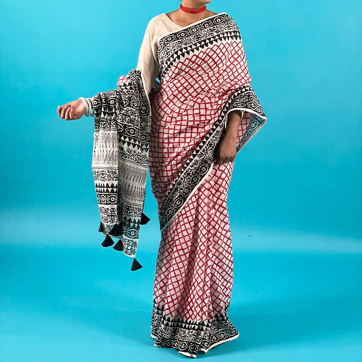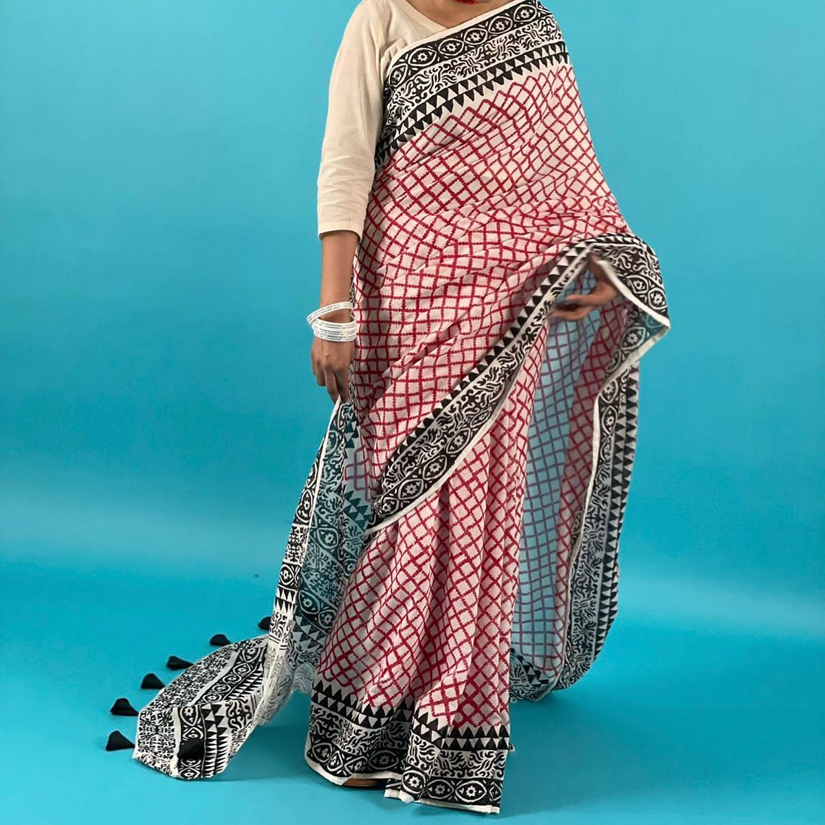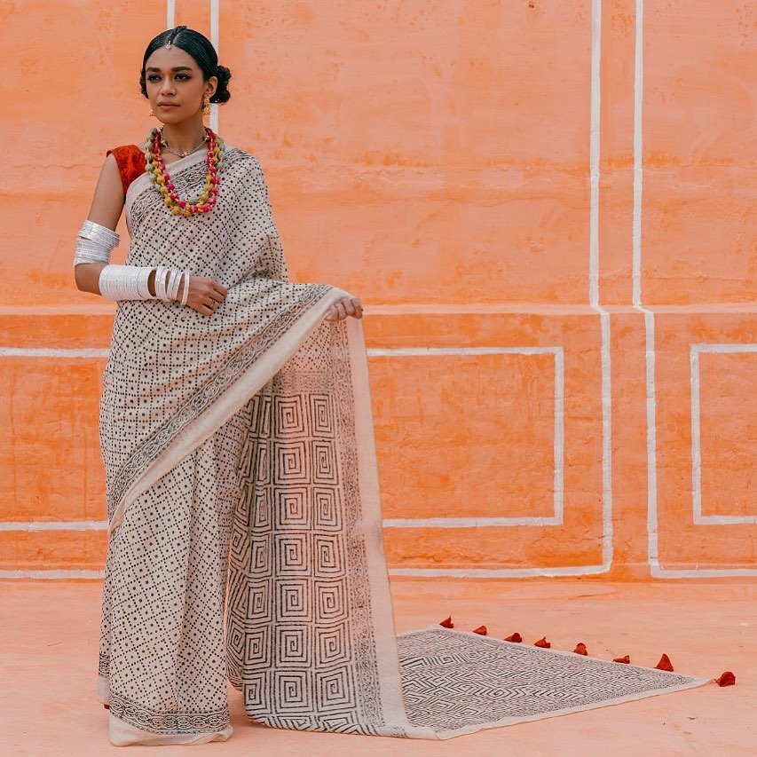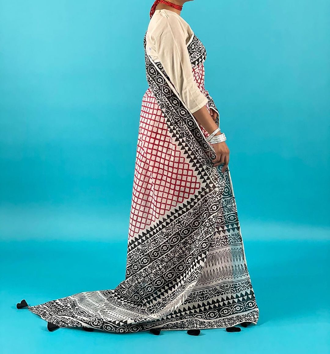 Tag: White cotton saree with black and red block print