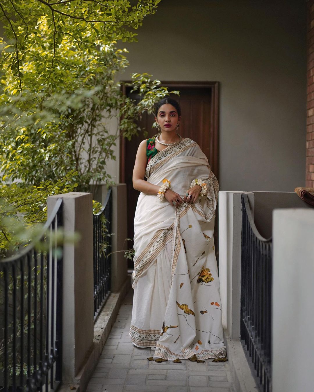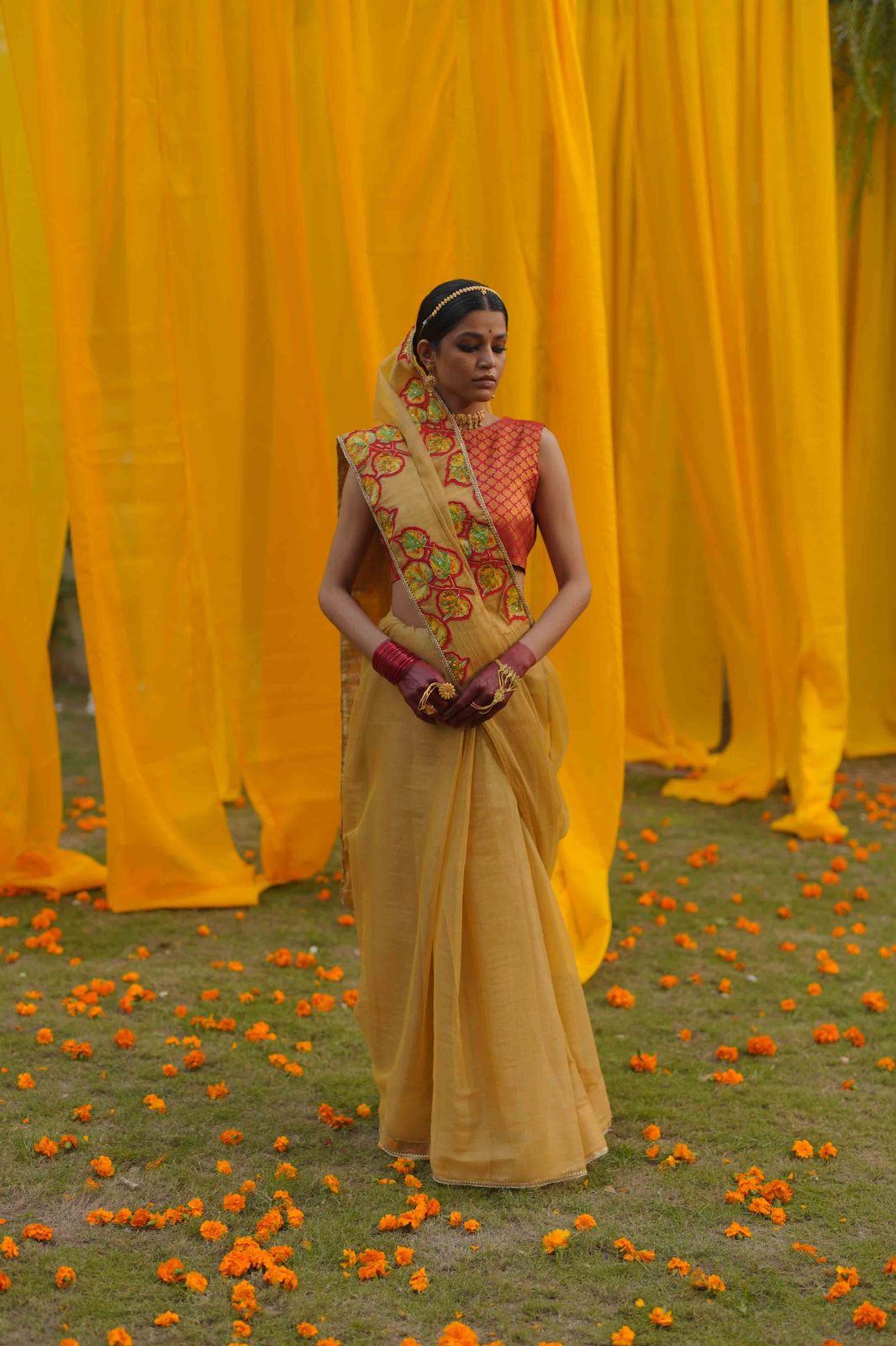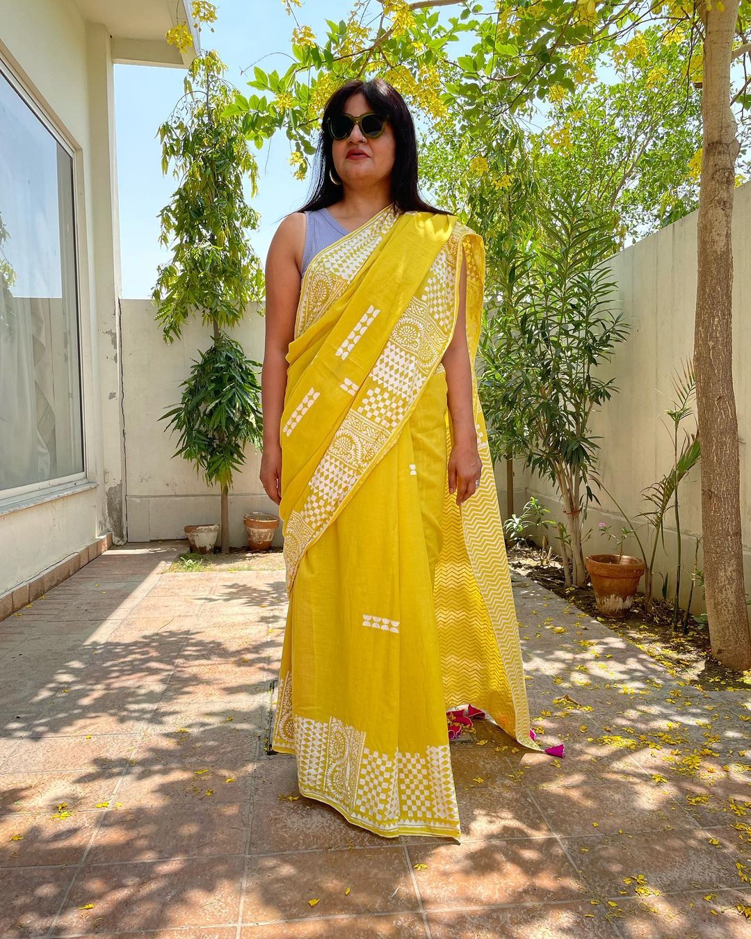 Dove Block-Printed Saree with transition from Blue to Yellow...